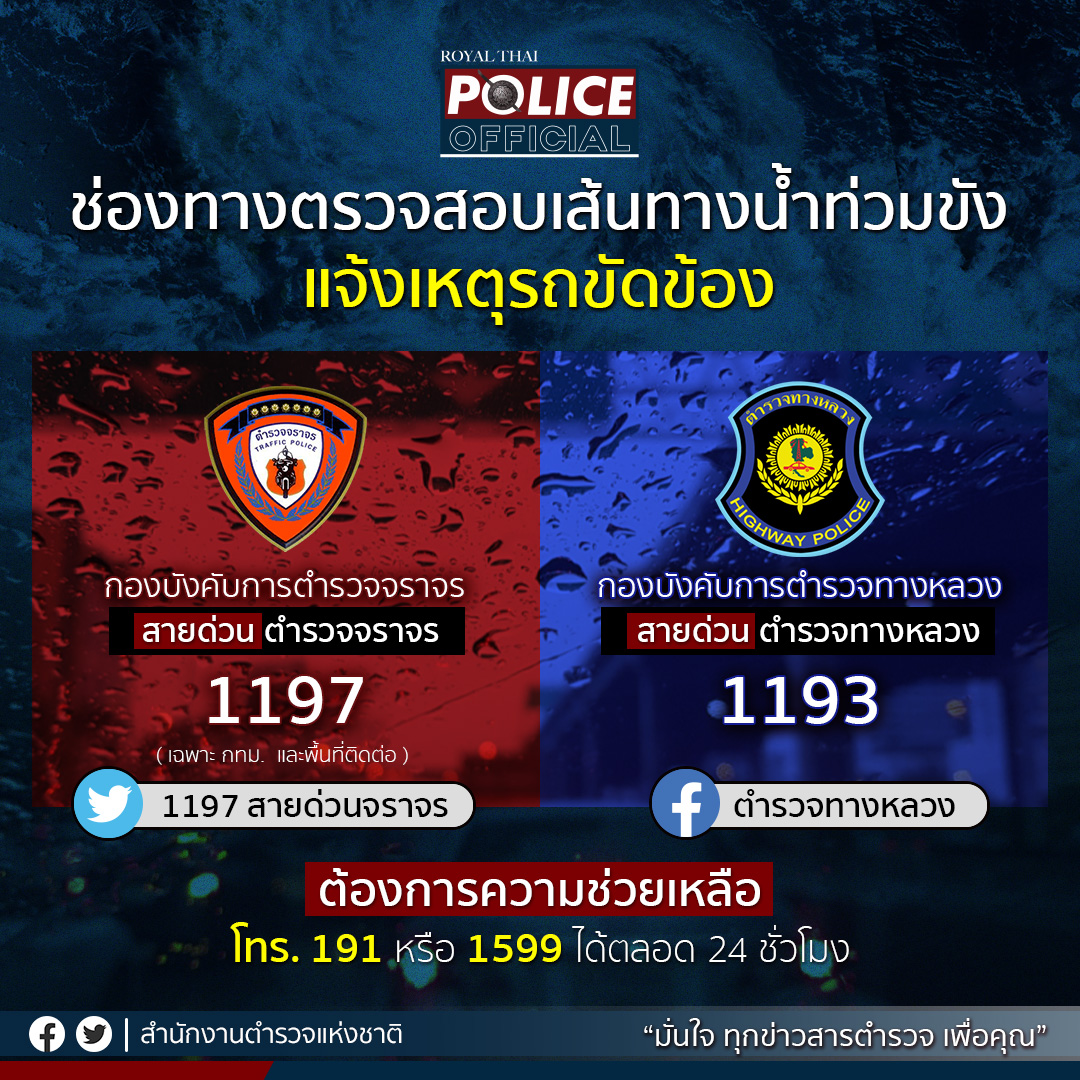 • กองบังคับการตำรวจทางหลวง โทรสายด่วนตำรวจทางหลวง 1193 หรือเฟซบุ๊ก ตำรวจทางหลวง