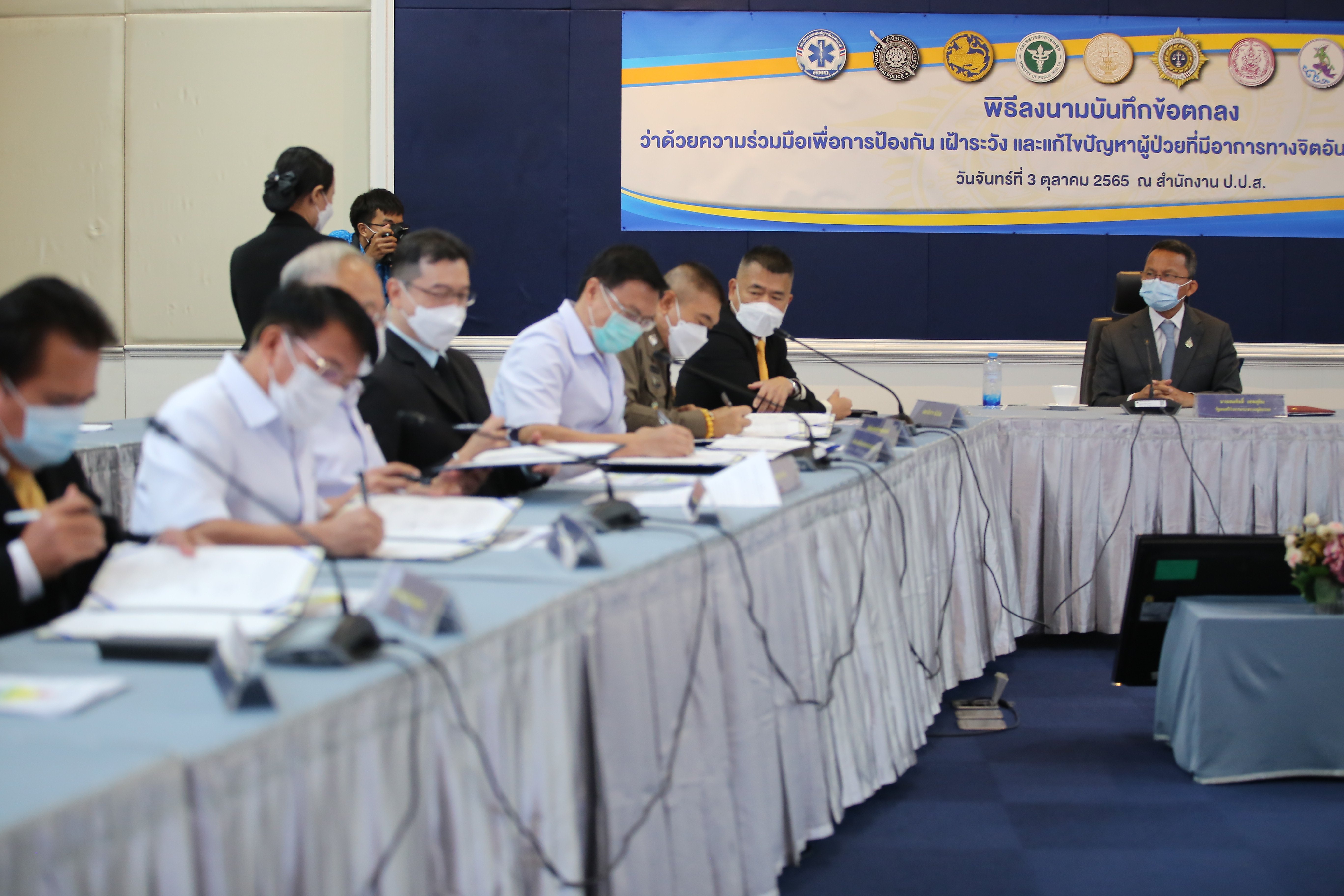 วันที่ 3 ตุลาคม 2565 เมื่อเวลา 10.00 น. นายสมศักดิ์ เทพสุทิน รัฐมนตรีว่าการกระทรวงยุติธรรม เป็นประธานการประชุมหารือแนวทางการแก้ไขปัญหาผู้มีอาการทางจิตจากการใช้สารเสพติด และพิธีลงนามบันทึกข้อตกลงว่าด้วยความร่วมมือ เพื่อการป้องกัน เฝ้าระวัง และแก้ไขปัญหาผู้ป่วยที่มีอาการทางจิต อันเนื่องมาจากการใช้ยาเสพติด ที่สำนักงาน ป.ป.ส. โดยมี น.ส.ณัฐธ์ภัสส์ ยงใจยุทธ ผู้ช่วย รมว.ยุติธรรม นายวิชัย ไชยมงคล เลขาธิการ ป.ป.ส. และผู้แทน 15 หน่วยงาน เช่น กระทรวงสาธารณสุข กระทรวงมหาดไทย กระทรวงพัฒนาสังคมและความมั่นคงของมนุษย์ สำนักงานตำรวจแห่งชาติ สถาบันการแพทย์ฉุกเฉินแห่งชาติ เข้าร่วม