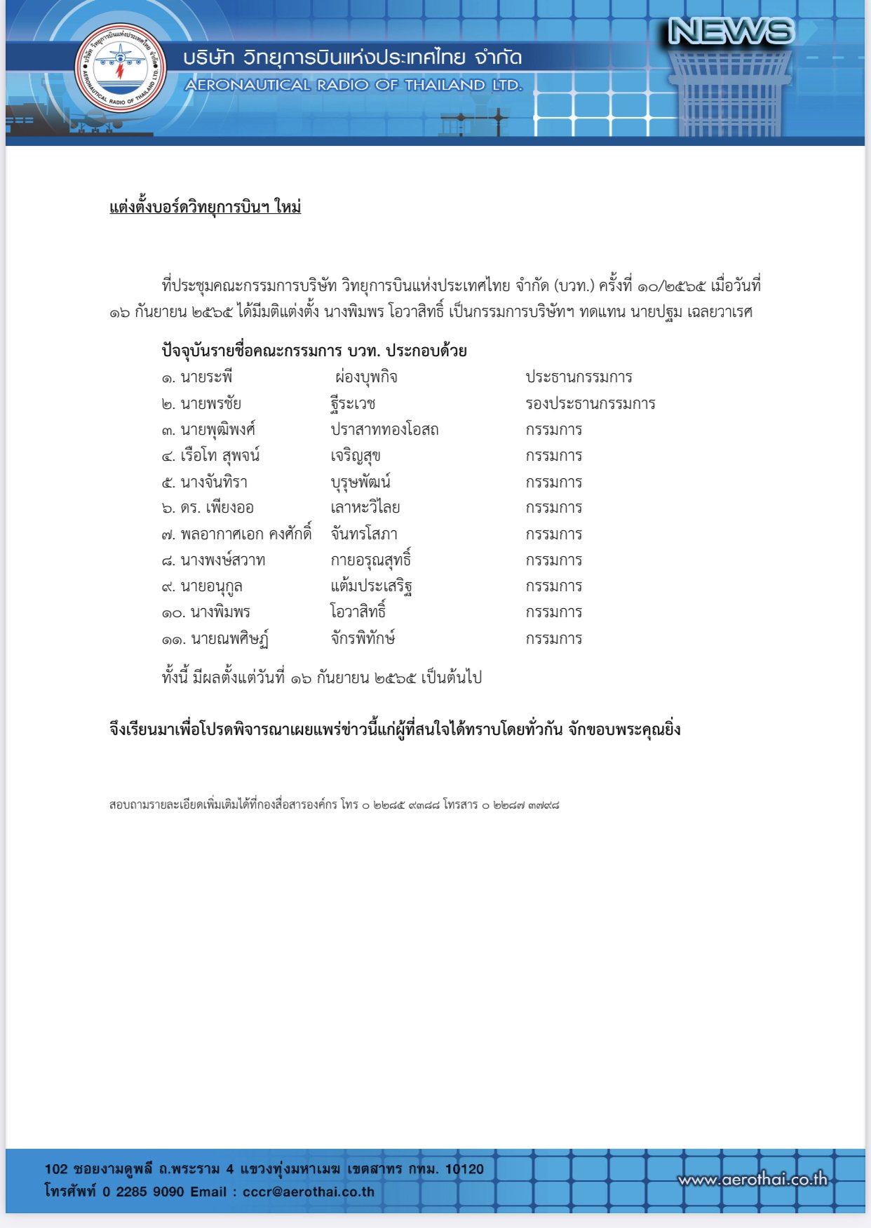 ที่ประชุมคณะกรรมการบริษัท วิทยุการบินแห่งประเทศไทย จำกัด (บวท.) ครั้งที่ 10/2565 เมื่อวันที่ 16 กันยายน 2565 ได้มีมติแต่งตั้ง นางพิมพร โอวาสิทธิ์ เป็นกรรมการบริษัทฯ ทดแทน นายปฐม เฉลยวาเรศ