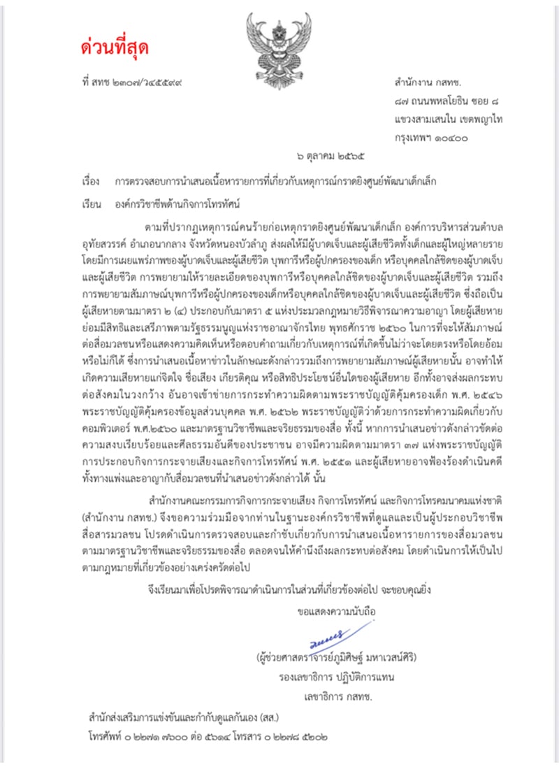 ผศ.ดร. ภูมิศิษฐ์ มหาเวสน์ศิริ รองเลขาธิการ ปฏิบัติการแทน เลขาธิการ กสทช. มีหนังสือถึง องค์กรวิชาชีพด้านกิจการโทรทัศน์ ความว่า ตามที่ปรากฏเหตุการณ์คนร้ายก่อเหตุกราดยิงศูนย์พัฒนาเด็กเล็ก อบต.อุทัยสวรรค์ อ.นากลาง จ.หนองบัวลำภู ส่งผลให้มีผู้บาดเจ็บและผู้เสียชีวิตทั้งเด็กและผู้ใหญ่หลายราย โดยมีการเผยแพร่ภาพของผู้บาดเจ็บและผู้เสียชีวิต บุพการีหรือผู้ปกครองของเด็ก หรือบุคคลใกล้ชิดของผู้บาดเจ็บและผู้เสียชีวิต