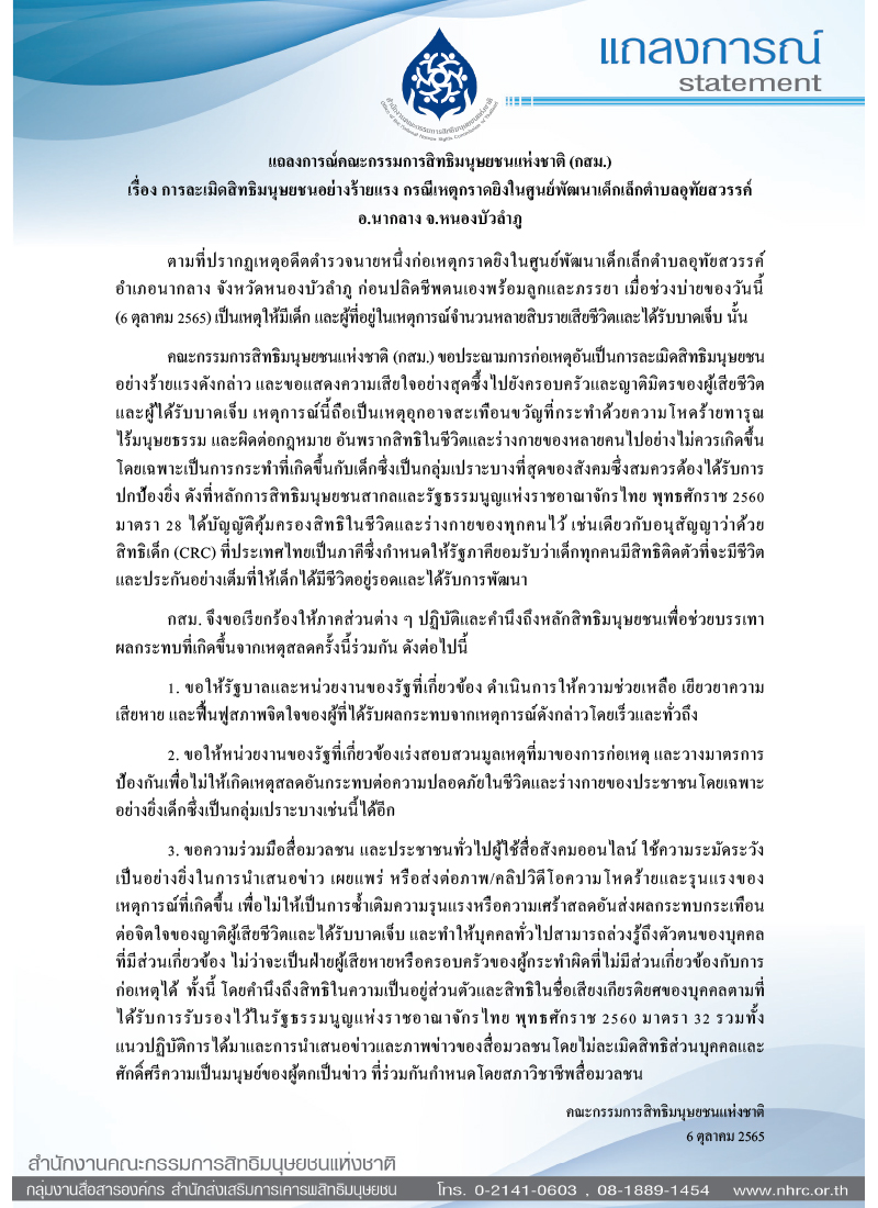 ขณะที่คณะกรรมการสิทธิมนุษยชนแห่งชาติ (กสม.) ออกแถลงการณ์ เรื่อง เรื่อง การละเมิดสิทธิมนุษยชนอย่างร้ายแรง กรณีเหตุกราดยิงในศูนย์พัฒนาเด็กเล็ก ต.อุทัยสวรรค์ อ.นากลาง จ.หนองบัวลำภู ความว่า ตามที่ปรากฏเหตุอดีตตำรวจนายหนึ่ง ก่อเหตุกราดยิงในศูนย์พัฒนาเด็กเล็ก ต.อุทัยสวรรค์ ก่อนปลิดชีพตนเองพร้อมลูกและภรรยา เมื่อช่วงบ่ายของวันนี้ (6 ตุลาคม 2565) เป็นเหตุให้มีเด็ก และผู้ที่อยู่ในเหตุการณ์จำนวนหลายสิบรายเสียชีวิตและได้รับบาดเจ็บ นั้น
