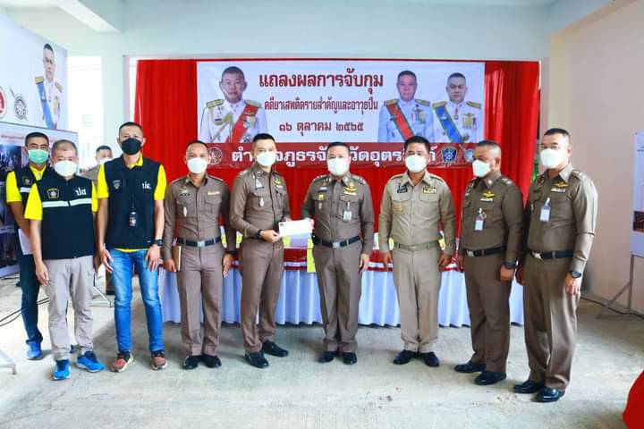 พร้อมด้วยเจ้าหน้าที่ที่เกี่ยวข้องร่วมแถลงข่าว ในโอกาสนี้ได้ชมเชย และมอบรางวัล แก่ข้าราชการตำรวจชุดจับกุม เพื่อเป็นขวัญและกำลังใจในการปฏิบัติหน้าที่