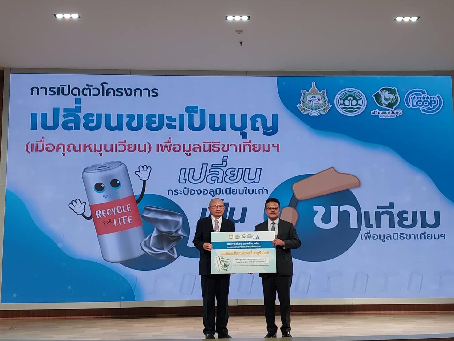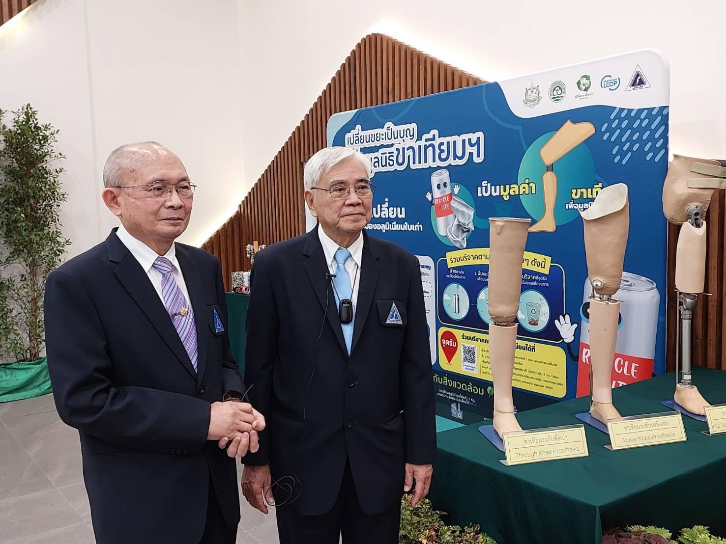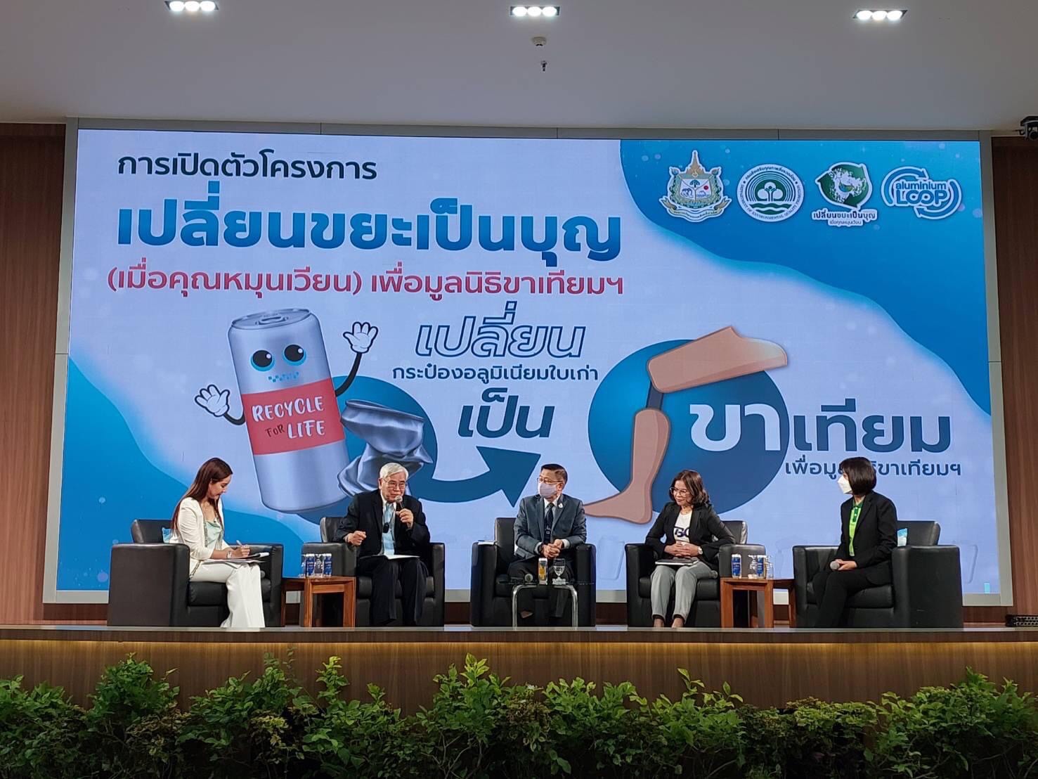 วันที่ 20 ตุลาคม 2565 ศาสตราจารย์คลินิก นายแพทย์นิเวศน์ นันทจิต เลขาธิการมูลนิธิขาเทียม ในสมเด็จพระศรีนครินทราบรมราชชนนี พร้อมด้วยคณะผู้บริหารฯ ร่วมพิธีเปิดตัวโครงการ “เปลี่ยนขยะเป็นบุญ” (เมื่อคุณหมุนเวียน) เพื่อมูลนิธิขาเทียมฯ และคุณเกรียงฤทธิ สุขเจริญสิน กรรมการมูลนิธิขาเทียมฯ ร่วมเป็นวิทยากรเสวนาในหัวข้อ “การรีไซเคิลบรรจุภัณฑ์ เพื่อมูลนิธิขาเทียมฯ” ณ อาคารกรมส่งเสริมคุณภาพสิ่งแวดล้อม โดยมีอธิบดีกรมส่งเสริมคุณภาพสิ่งแวดล้อมเป็นประธาน ร่วมกับหน่วยงานของรัฐและเอกชนอีกหลายแห่ง เพื่อสร้างกระบวนการมีส่วนร่วมการจัดการปัญหาปริมาณขยะที่เพิ่มสูงขึ้นในปัจจุบันภายใต้แนวคิดการพัฒนาเศรษฐกิจชีวภาพ เศรษฐกิจหมุนเวียน และเศรษฐกิจสีเขียว (BCG) เป็นการสนับสนุนการนำบรรจุภัณฑ์กลับเข้าสู่กระบวนการทำประโยชน์ใหม่และสนับสนุนการดำเนินงานของมูลนิธิขาเทียมฯ