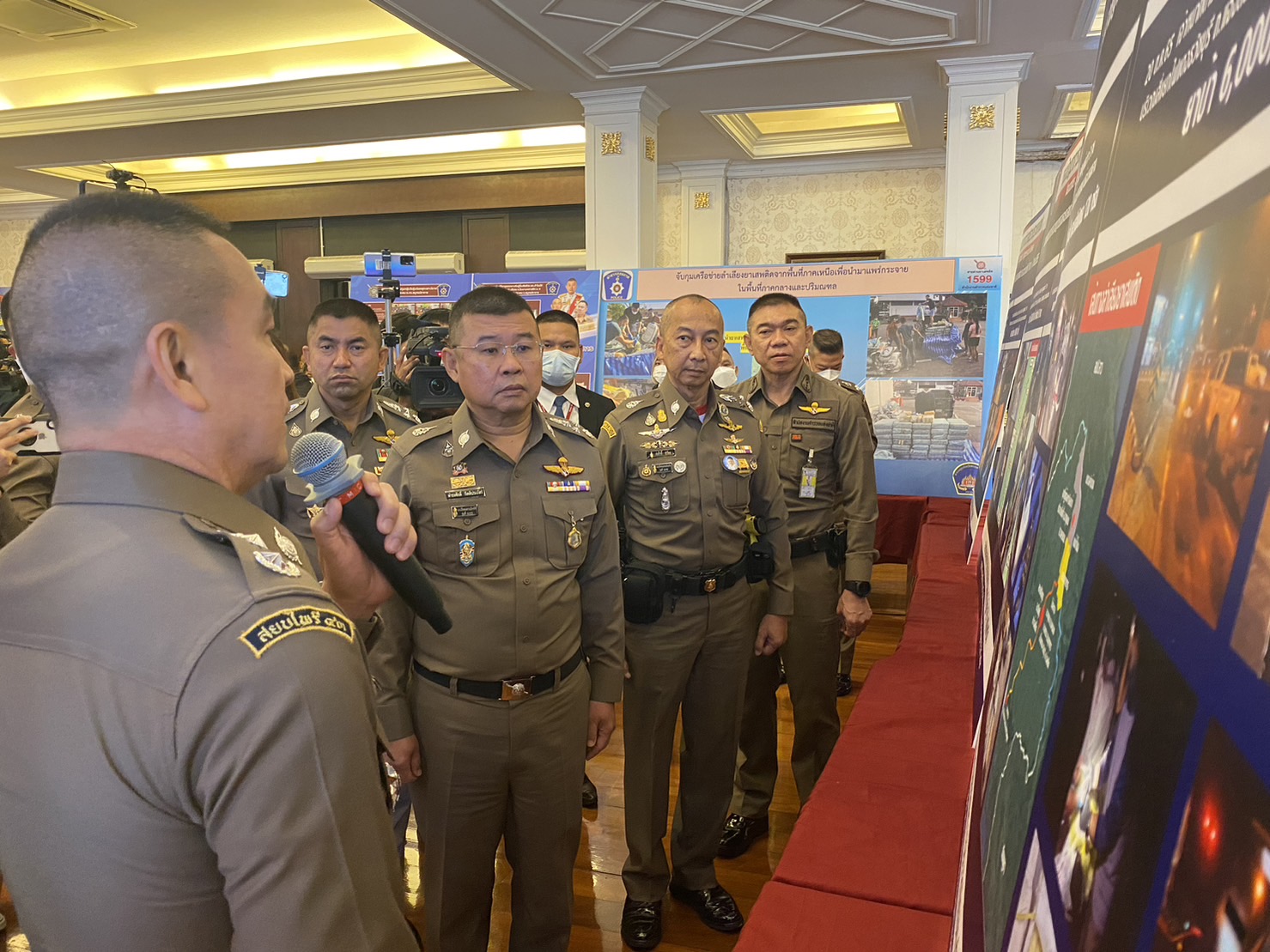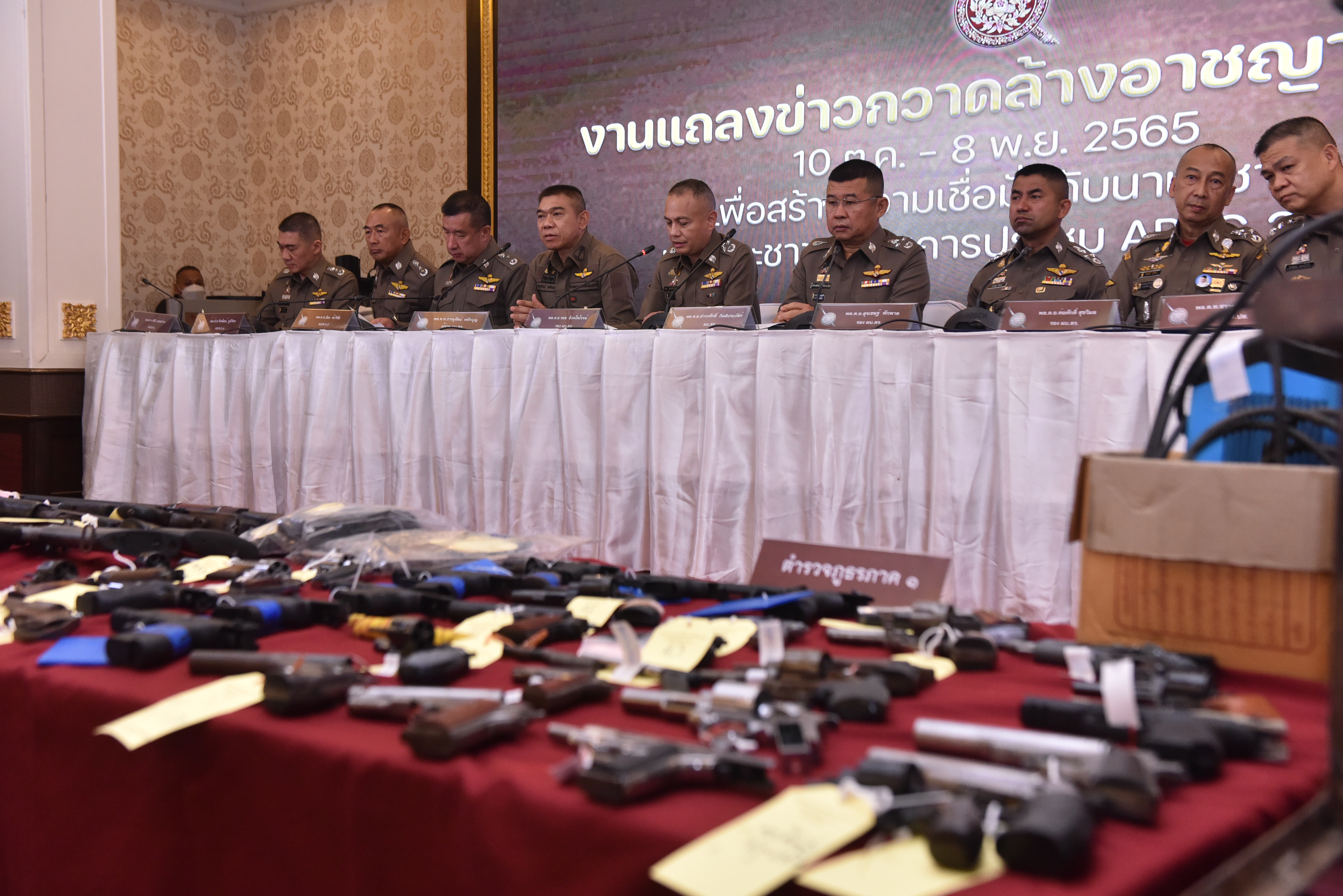 วันนี้ (8 พ.ย.65) เวลา 10.30 น. ที่ สำนักงานตำรวจแห่งชาติ พล.ต.อ.ดำรงศักดิ์ กิตติประภัสร์ ผบ.ตร. พร้อมด้วย พล.ต.อ.รอย อิงคไพโรจน์ รอง ผบ.ตร. ,พล.ต.อ.สุรเชษฐ์ หักพาล รอง ผบ.ตร. ,พล.ต.อ.ต่อศักดิ์ สุขวิมล รอง ผบ.ตร. ,พล.ต.ท.ภาณุรัตน์ หลักบุญ ผู้ช่วย ผบ.ตร. ,พล.ต.ท.ธิติ แสงสว่าง ผบช.น.,พล.ต.ท.จิรพัฒน์ ภูมิจิตร ผบช.ภ.1 ,พล.ต.ท.ปิยะ ต๊ะวิชัย ผบช.ภ.5 พล.ต.ท.สรายุทธ สงวนโภคัย ผบช.ปส. และ พล.ต.ต.วิวัฒน์ ชัยสังฆะ รอง ผบช.ก., พล.ต.ต.วสันต์ เตชะอัครเกษม รอง ผบช.ภ.8 ร่วมแถลงผลการระดมกวาดล้างอาชญากรรม เพื่อสร้างความเชื่อมั่นกับนานาชาติ และประชาชน ก่อนการประชุม APEC 2022