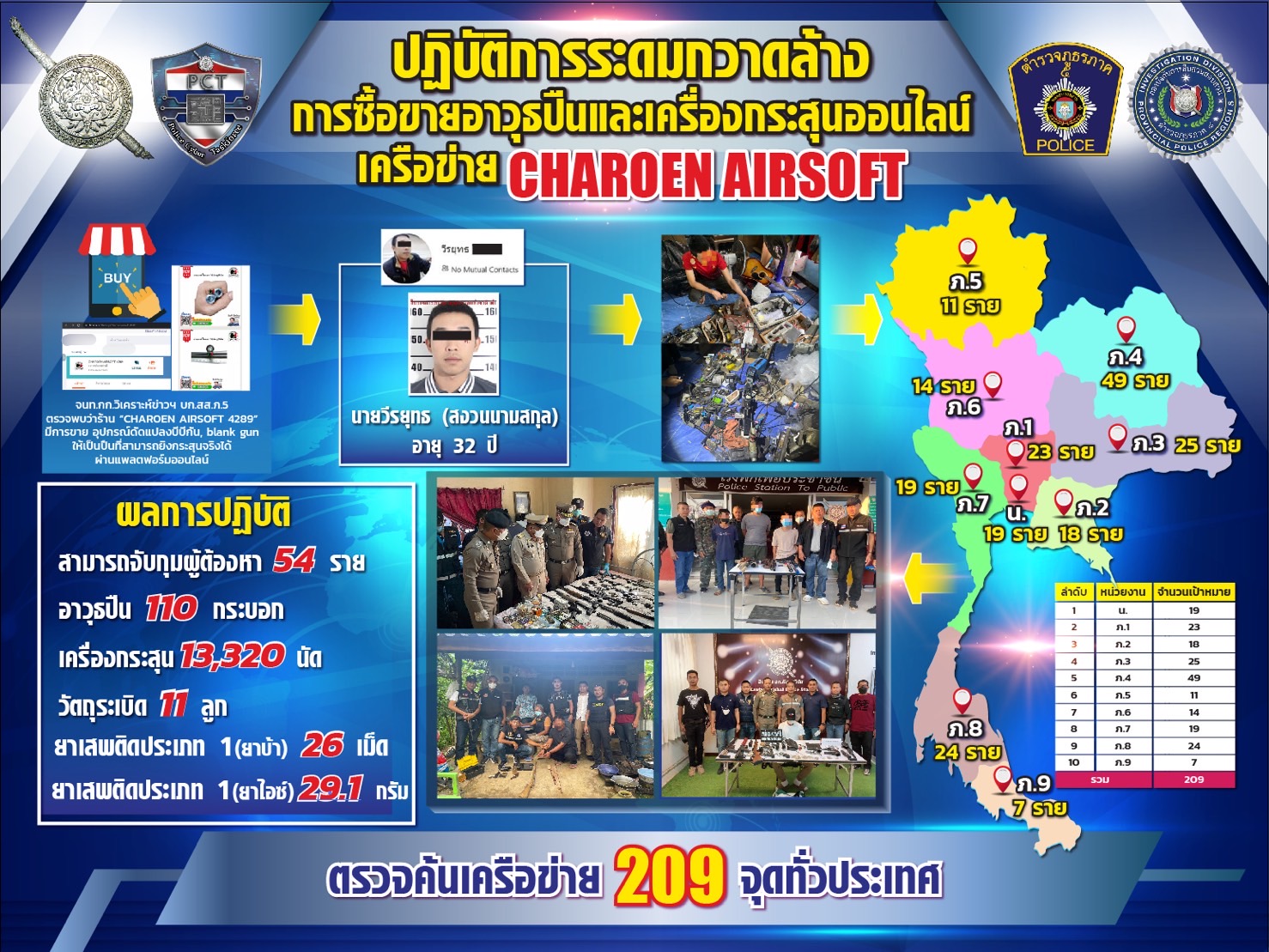 ก่อนมอบหมายให้ พล.ต.ท.ภาณุรัตน์ หลักบุญ ผู้ช่วย ผบ.ตร. /รอง ผอ.ศปอส. นำกำลังตำรวจ บช.สอท.,ภ.1, ภ.8 ขยายผลไปถึงผู้ซื้อและตัวแทนจำหน่าย 209 แห่ง ทั่วประเทศ สามารถจับกุมผู้ต้องเพิ่มอีก 54 ราย ยึดของกลางอาวุธปืนเถื่อน 110 กระบอก เครื่องกระสุนปืน 13,320 นัด และวัตถุระเบิดอีก 11 ลูก