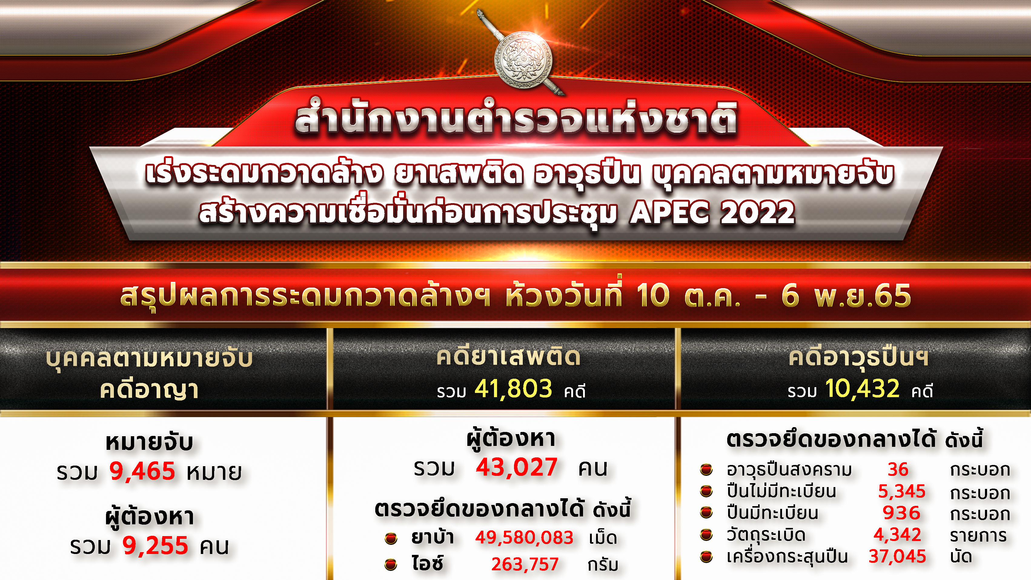 พล.ต.อ.ดำรงศักดิ์ฯ กล่าวว่า สำนักงานตำรวจแห่งชาติได้มีระดมกวาดล้างปราบปรามผู้กระทำความผิดที่ความผิดเกี่ยวกับอาวุธปืนเถื่อน อาวุธปืนสงคราม ยาเสพติด และหมายจับค้างเก่า ก่อนที่จะมีการจัดการประชุมผู้นำ APEC ปลายเดือนนี้ เพื่อสร้างความเชื่อมั่นให้กับประชาชน โดยมีการระดมกวาดล้างในห้วงระหว่างวันที่ 10 ต.ค.-8 พ.ย. 65 ผลการดำเนินการ ดังนี้