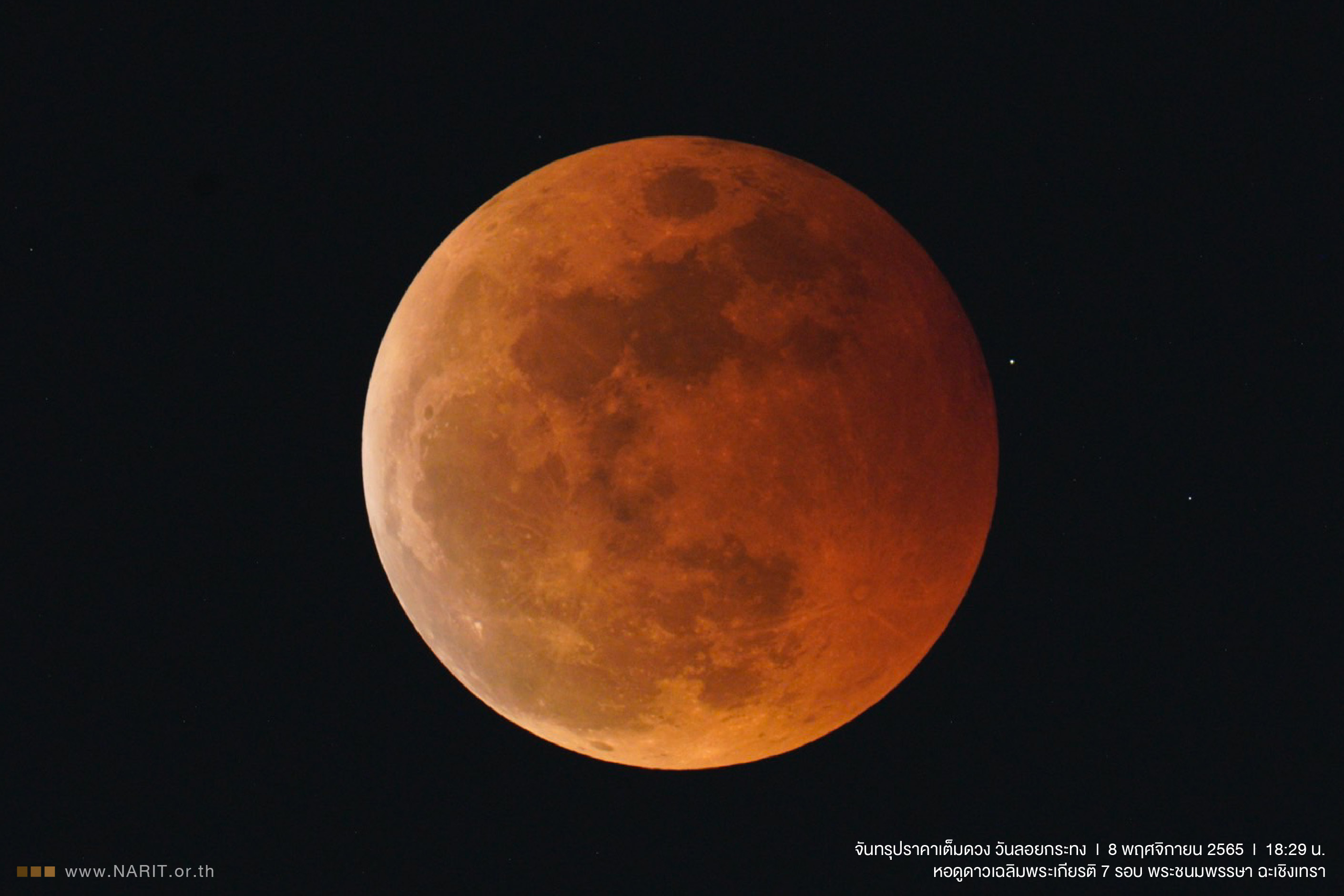 สถาบันวิจัยดาราศาสตร์แห่งชาติ (องค์การมหาชน) (สดร.) กระทรวงการอุดมศึกษา วิทยาศาสตร์ วิจัยและนวัตกรรม (อว.) เผยภาพปรากฏการณ์จันทรุปราคาเต็มดวงเหนือฟ้าเมืองไทย ขณะเกิดคราสเต็มดวง ดวงจันทร์เต็มดวงปรากฏเป็นสีแดงอิฐ มีดาวยูเรนัสปรากฏอยู่ด้านขวา บันทึกภาพ ณ หอดูดาวเฉลิมพระเกียรติ 7 รอบ พระชนมพรรษา ฉะเชิงเทรา เวลาประมาณ 18:29 น. ช่วงหัวค่ำวันที่ 8 พฤศจิกายน 2565 ซึ่งตรงกับวันลอยกระทงในปีนี้ มีประชาชนชาวไทยให้ความสนใจติดตามชมปรากฏการณ์ดาราศาสตร์ครั้งนี้กันอย่างคึกคักทั่วประเทศ