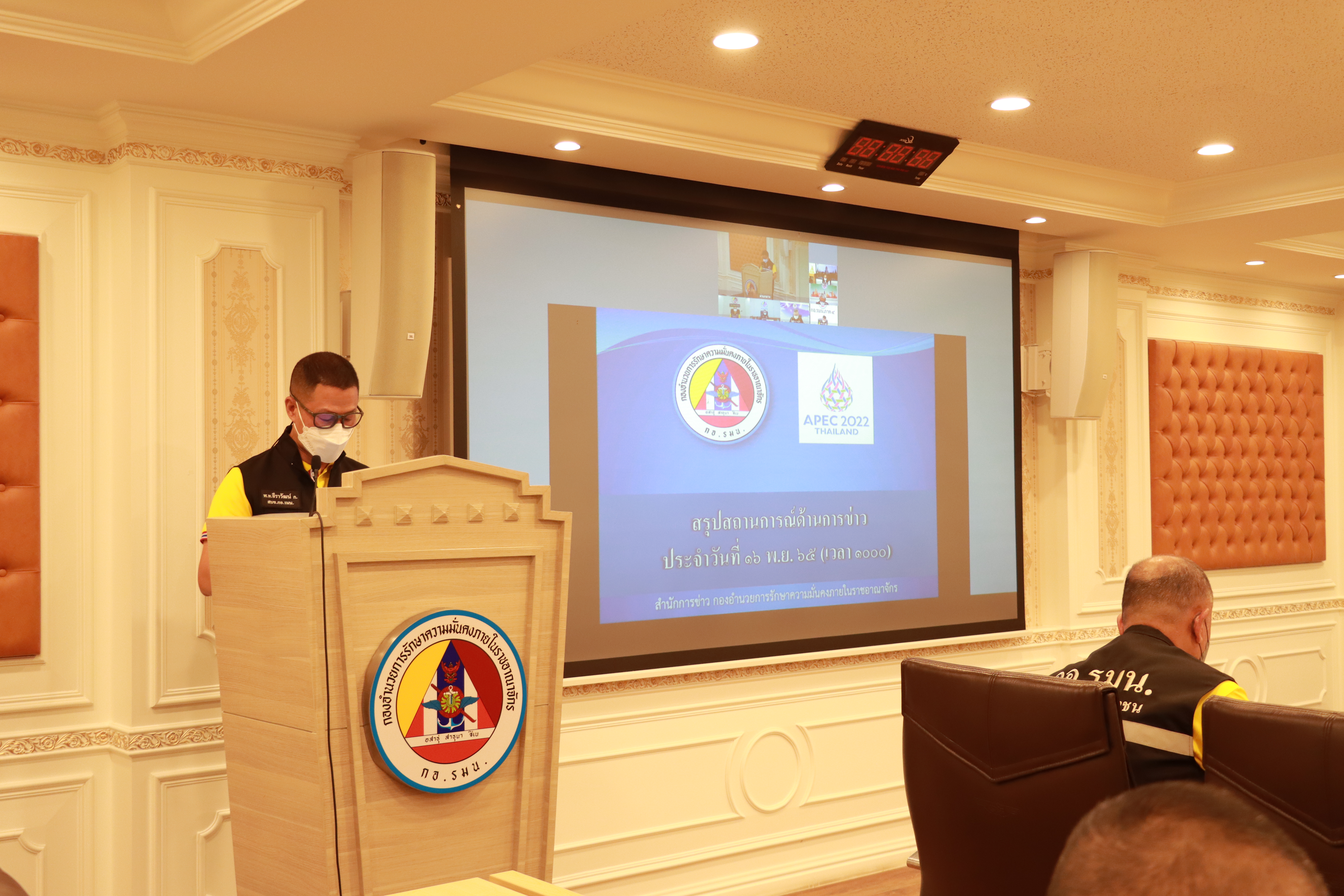 ในส่วนของกองอำนวยการรักษาความมั่นคงภายในราชอาณาจักร (กอ.รมน) พล.อ.อุกฤษฎ์ บุญตานนท์ เลขาธิการ กอ.รมน. ได้กำหนดให้มีการจัดการประชุมเพื่อติดตามสถานการณ์สนับสนุนการประชุมเอเปค 20222 ประจำวันขึ้นที่ กอ.รมน.(ส่วนกลาง) ในห้วง 14 – 19 พ.ย. 65 มี 3 ห้วงเวลาในแต่ละวัน