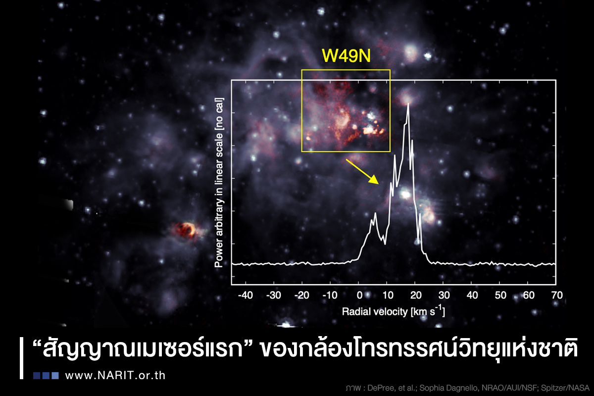 สถาบันวิจัยดาราศาสตร์แห่งชาติ (องค์การมหาชน) กระทรวงการอุดมศึกษา วิทยาศาสตร์ วิจัยและนวัตกรรม (อว.) เผยทีมวิศวกรศูนย์ปฏิบัติการดาราศาสตร์วิทยุ และนักวิจัยสถาบันวิจัยดาราศาสตร์แห่งชาติ ร่วมกันทดสอบระบบการทำงานกล้องโทรทรรศน์วิทยุแห่งชาติในโหมดสังเกตการณ์สเปกตรัม และประสบความสำเร็จในการรับสัญญาณแรกของ “เมเซอร์” จากบริเวณก่อกำเนิดดาวฤกษ์มวลมาก Westerhout 49 North (W49N) ด้วยอุปกรณ์รับสัญญาณคลื่นความถี่วิทยุย่านแอล (L-band) เมื่อวันที่ 25 ตุลาคม 2565 ที่ผ่านมา หลังจากก่อนหน้านี้รับสัญญาณจากทางช้างเผือกและพัลซาร์ได้สำเร็จ