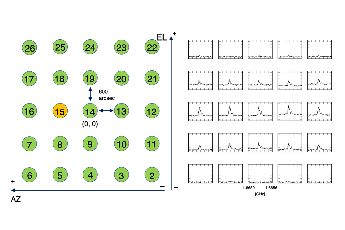 ดร. โคอิชิโร่ ซุกิยามะ นักวิจัยด้านการกำเนิดของดาวฤกษ์มวลมาก กลุ่มวิจัยดาราศาสตร์วิทยุ สดร. ศึกษาวิวัฒนาการของดาวฤกษ์มวลมากโดยการสังเกตเมเซอร์ กล่าวว่า สัญญาณแรกของเมเซอร์ในครั้งนี้ มาจากการทดสอบอุปกรณ์รับสัญญาณย่านแอล (L-Band) ที่ระดับความถี่ 1.0-1.8 กิกะเฮิร์ตซ์ ใช้สังเกตเมเซอร์ประเภทไฮดรอกซิล (OH) ในช่วงความถี่ 1.665 กิกะเฮิร์ตซ์และ 1.667 กิกะเฮิร์ตซ์ บริเวณเกิดดาวฤกษ์มวลมาก W49N ด้วยวิธีการสแกนแบบแรสเตอร์ (Raster scan) ซึ่งจะค่อย ๆ ขยับจานรับสัญญาณด้วยอัตราเร็วคงที่ไปตามแนวระนาบและแนวตั้งฉาก (ตามลำดับตัวเลขในภาพประกอบ) โดยแต่ละการสังเกตการณ์จะเว้นช่องว่างเป็นระยะ 600 ฟิลิบดา (arcsec) ครอบคลุมพื้นที่สังเกตการณ์เป็นรูปสี่เหลี่ยมจัตุรัส วิธีการสังเกตการณ์เช่นนี้ สามารถใช้ศึกษาวัตถุท้องฟ้าได้หลากหลายชนิด เช่น กลุ่มแก๊สในอวกาศ พัลซาร์ กาแล็กซี เป็นต้น