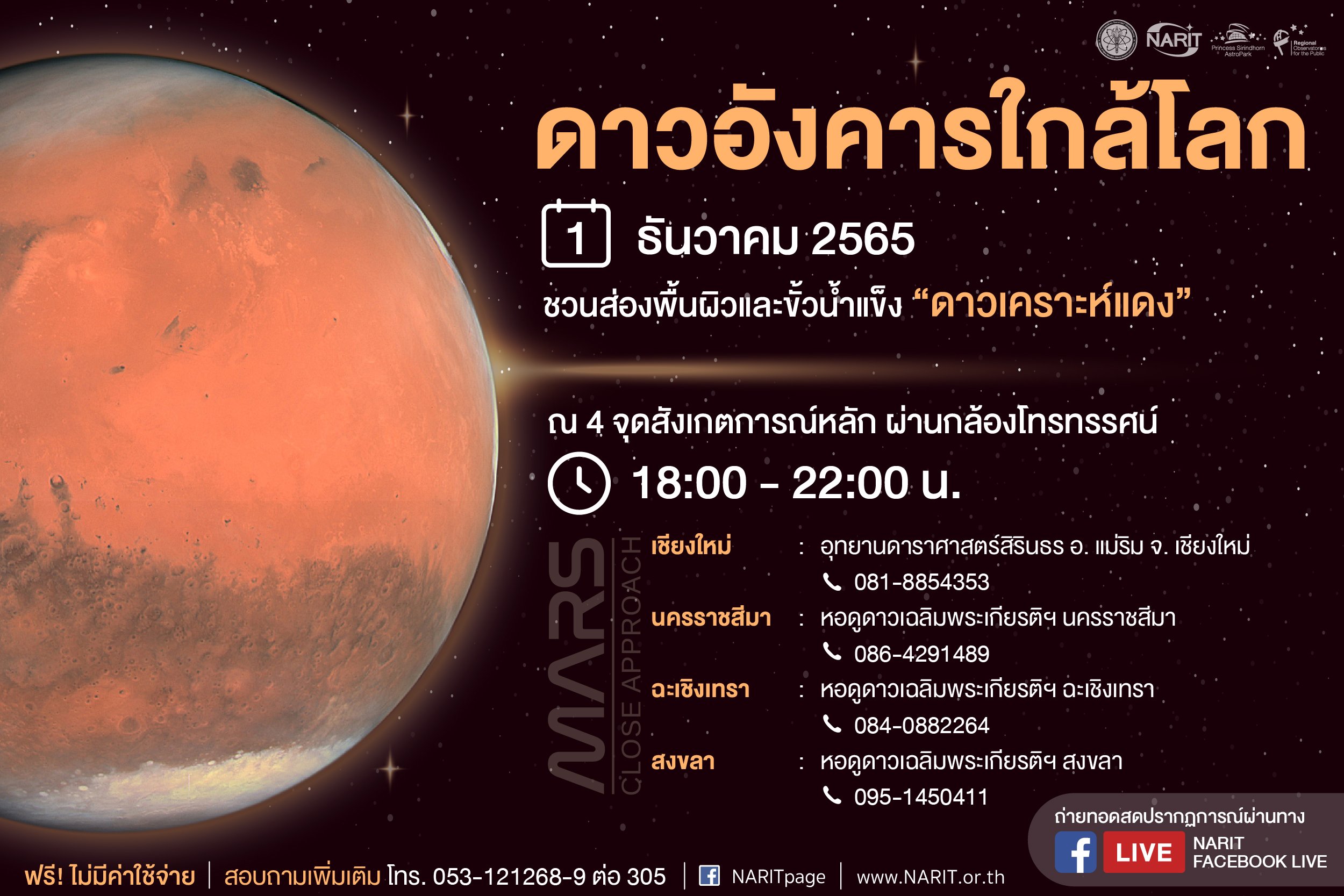 สถาบันวิจัยดาราศาสตร์แห่งชาติ (องค์การมหาชน) (สดร.) กระทรวงการอุดมศึกษา วิทยาศาสตร์ วิจัยและนวัตกรรม (อว.) ชวนจับตา “ดาวอังคารใกล้โลก” 1 ธันวาคม 2565 ปรากฏสีส้มแดงสว่างเด่นชัดตลอดคืนจนถึงรุ่งเช้า เตรียมจัดส่องพื้นผิวและขั้วน้ำแข็งดาวอังคารผ่านกล้องโทรทรรศน์ 4 แห่งที่ เชียงใหม่ นครราชสีมา ฉะเชิงเทรา สงขลา ฟรี! ไม่มีค่าใช้จ่าย หรือรับชมถ่ายทอดสดปรากฏการณ์ผ่านทาง https://www.facebook.com/NARITpage