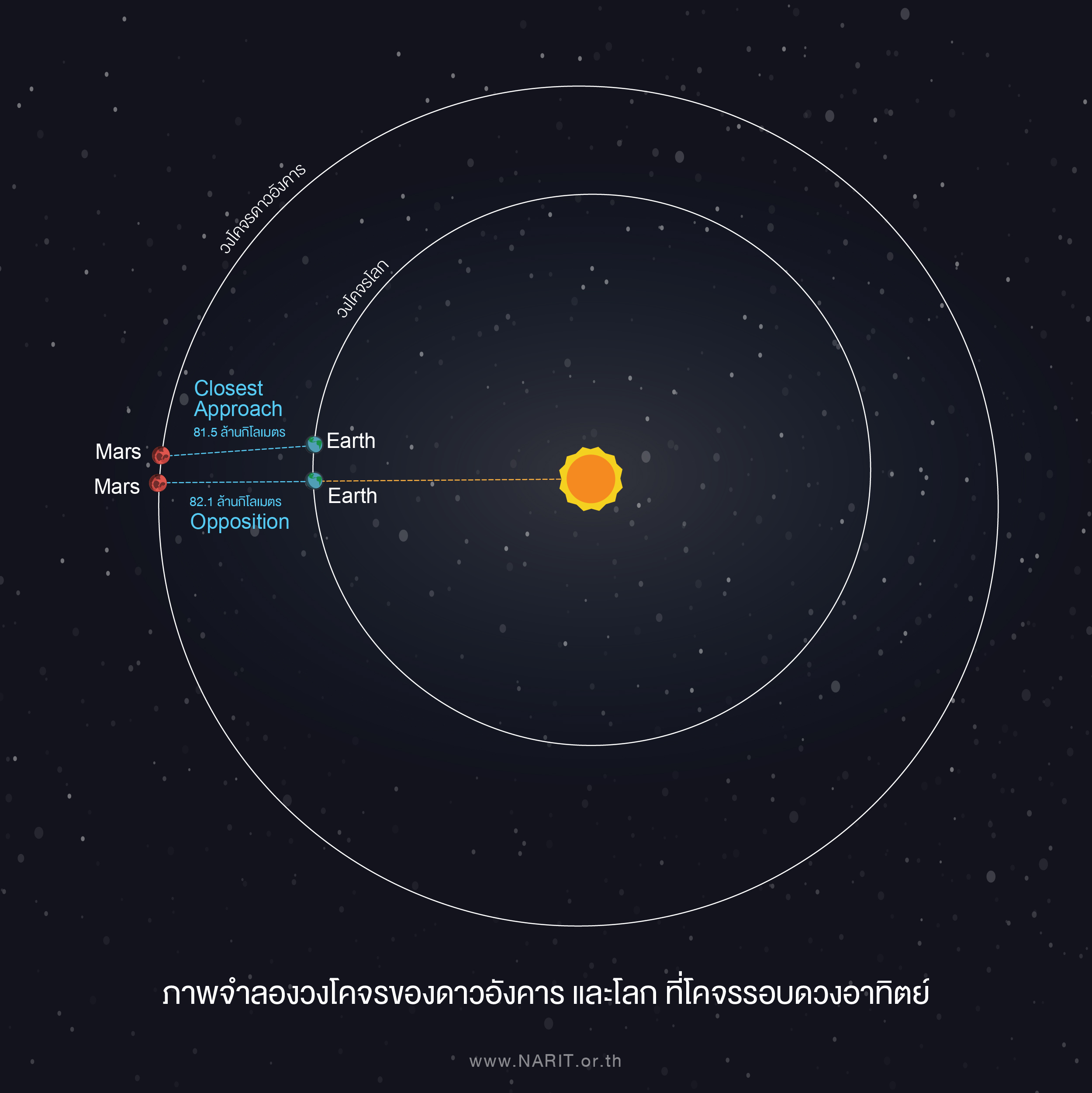 เนื่องจากวงโคจรของดาวอังคารค่อนข้างรี และอยู่ใกล้โลกมาก เมื่อเทียบกับดาวเคราะห์วงนอกดวงอื่น ๆ เป็นผลให้วันที่ดาวอังคารอยู่ตำแหน่งตรงข้ามดวงอาทิตย์ จะไม่ใช่วันที่ดาวอังคารเข้าใกล้โลกมากที่สุด ต่างจากดาวเสาร์และดาวพฤหัสบดี ทั้งนี้ ดาวอังคารจะเข้าใกล้โลกในทุก ๆ 2 ปี 2 เดือน และจะเข้าใกล้โลกมากที่สุดทุก ๆ 15 – 17 ปี