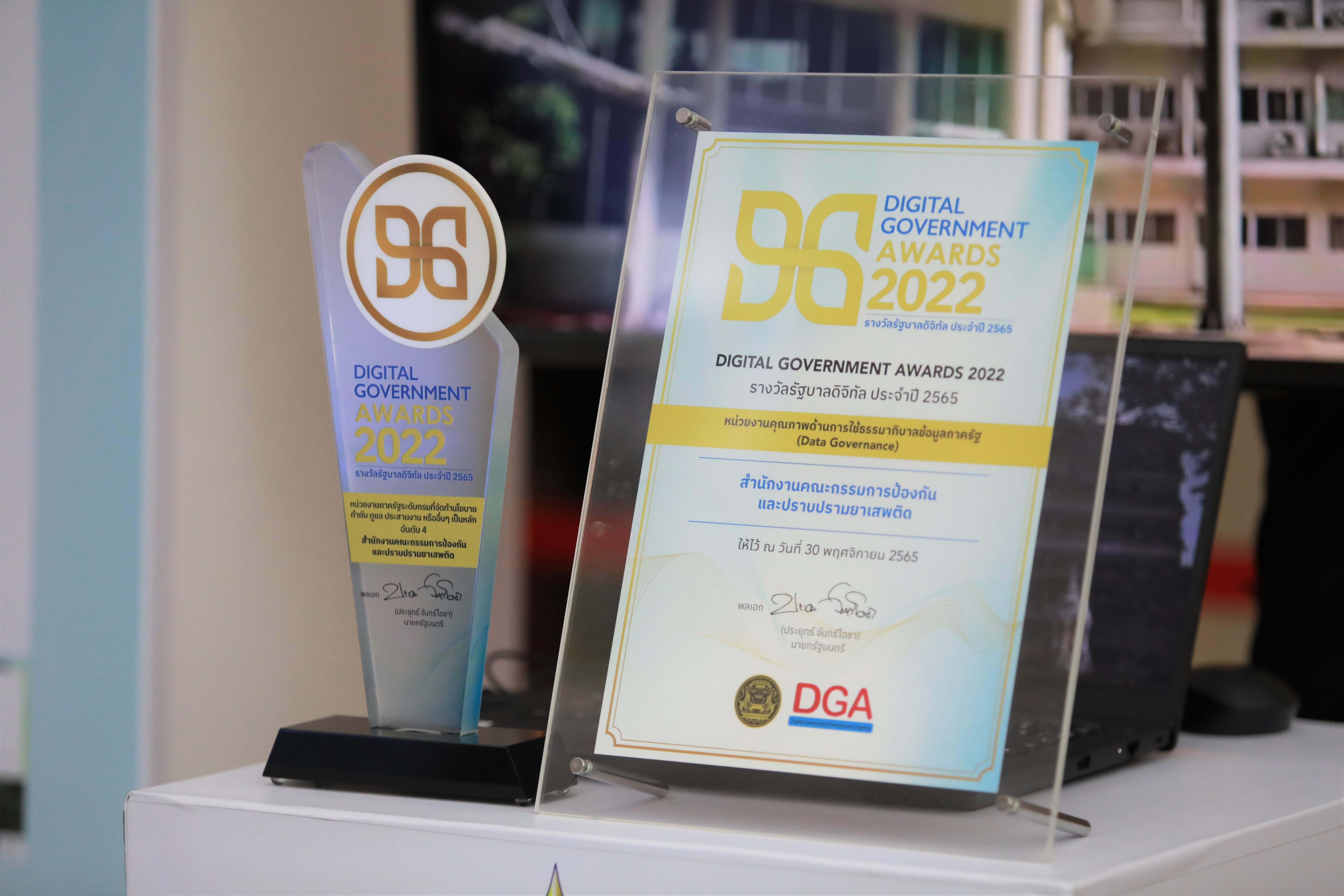 เลขาธิการ ป.ป.ส. กล่าวว่า สำนักงาน ป.ป.ส. ในฐานะองค์กรนำในการพัฒนาและขับเคลื่อนยุทธศาสตร์การป้องกันและแก้ไขปัญหายาเสพติดของประเทศ ได้รับรางวัลรัฐบาลดิจิทัล ประจำปี 2565 จำนวน 2 รางวัลจาก พลเอก ประยุทธ์ จันทร์โอชา นายกรัฐมนตรี ในงาน “Digital Government Awards 2022” ซึ่งจัดโดยสำนักงานพัฒนารัฐบาลดิจิทัล (องค์การมหาชน) หรือ DGA ณ ตึกสันติไมตรี ทำเนียบรัฐบาล โดยสำนักงาน ป.ป.ส. รับรางวัลหน่วยงานภาครัฐระดับกรมที่จัดทำนโยบาย กำกับ ดูแล ประสานงานหรืออื่นๆ เป็นหลัก เป็นอันดับที่ 4 และรางวัลหน่วยงานคุณภาพด้านการใช้ธรรมมาภิบาลข้อมูลภาครัฐ (Data Governance)