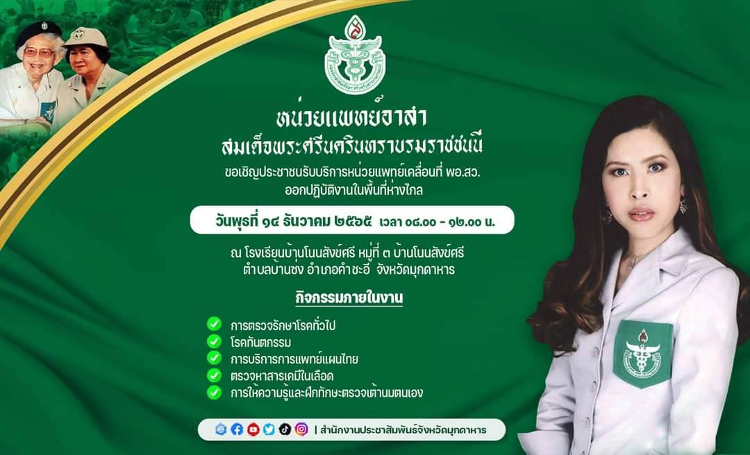 วันที่ 14 ธันวาคม 2565 (เวลา 09.30 น.) นายวรญาณ บุญณราช ผู้ว่าราชการจังหวัดมุกดาหาร มอบหมายให้ นายวุฒิชัย เสาวโกมุท รองผู้ว่าราชการจังหวัดมุกดาหาร เป็นประธานในพิธีเปิดงาน หน่วยแพทย์เคลื่อนที่อาสาสมเด็จพระศรีนครินทราบรมราชชนนี (พอ.สว.) โดยมีนางอัญชลี กัลมาพิจิตร บุญณราช นายกเหล่ากาชาดจังหวัดมุกดาหาร นายอำเภอคำชะอี หัวหน้าส่วนราชการ และหน่วยงานที่เกี่ยวข้อง เข้าร่วมพิธี ณ โรงเรียนบ้านโนนสังข์ศรี หมู่ 3 บ้านโนนสังข์ศรี ตำบลบ้านซ่ง อำเภอคำชะอี จังหวัดมุกดาหาร