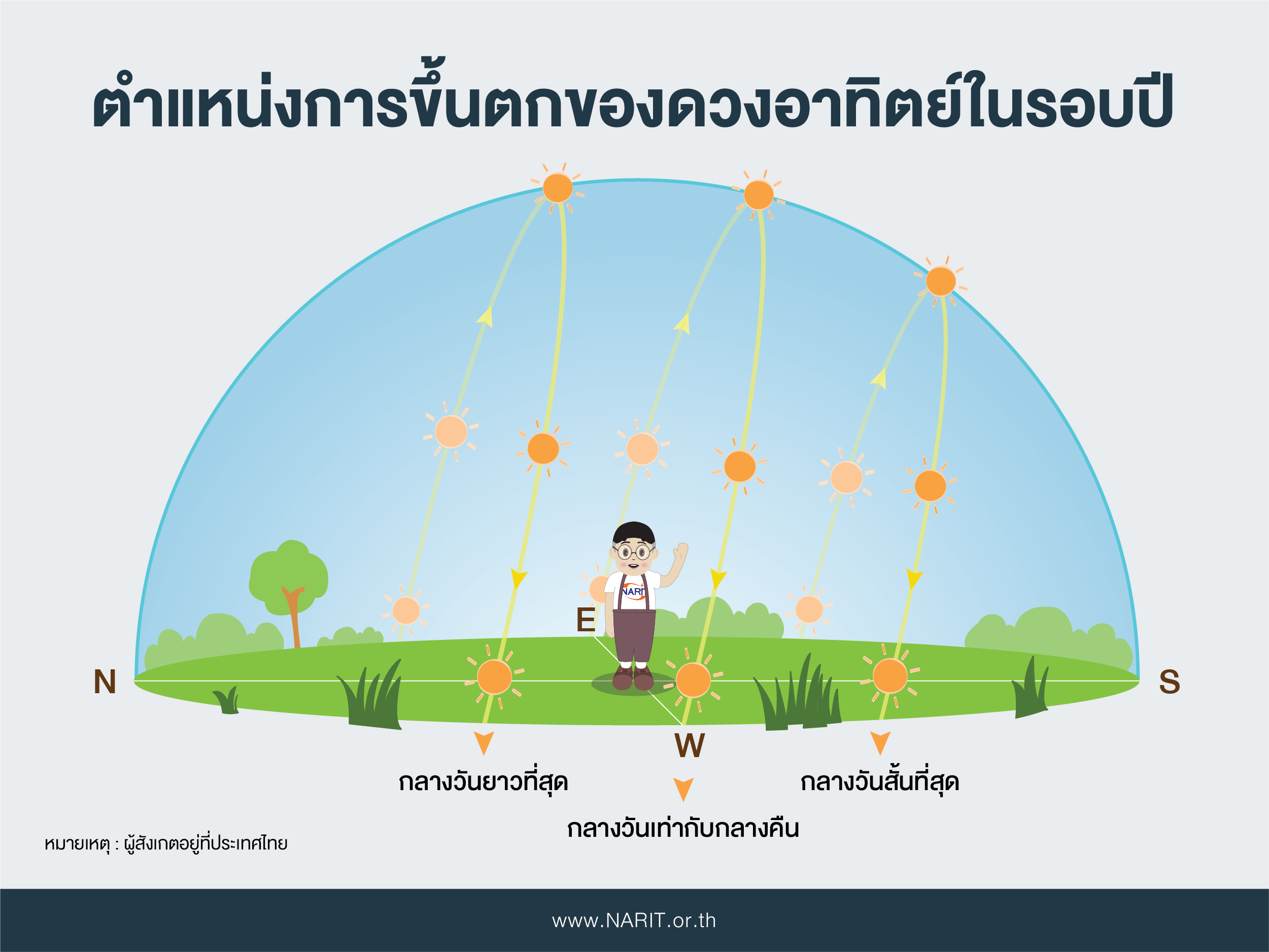 ตลอดระยะเวลา 1 ปีที่โลกโคจรรอบดวงอาทิตย์ จะเกิดปรากฏการณ์สำคัญที่เกี่ยวข้องกับการขึ้นและตกของดวงอาทิตย์ทั้งหมด 4 ครั้ง ได้แก่ วันครีษมายัน เป็นวันที่กลางวันยาวนานที่สุด วันเหมายัน เป็นวันที่กลางคืนยาวนานที่สุด วันวสันตวิษุวัตและวันศารทวิษุวัต เป็นวันที่มีกลางวันและกลางคืนยาวนานเท่ากัน