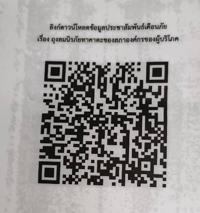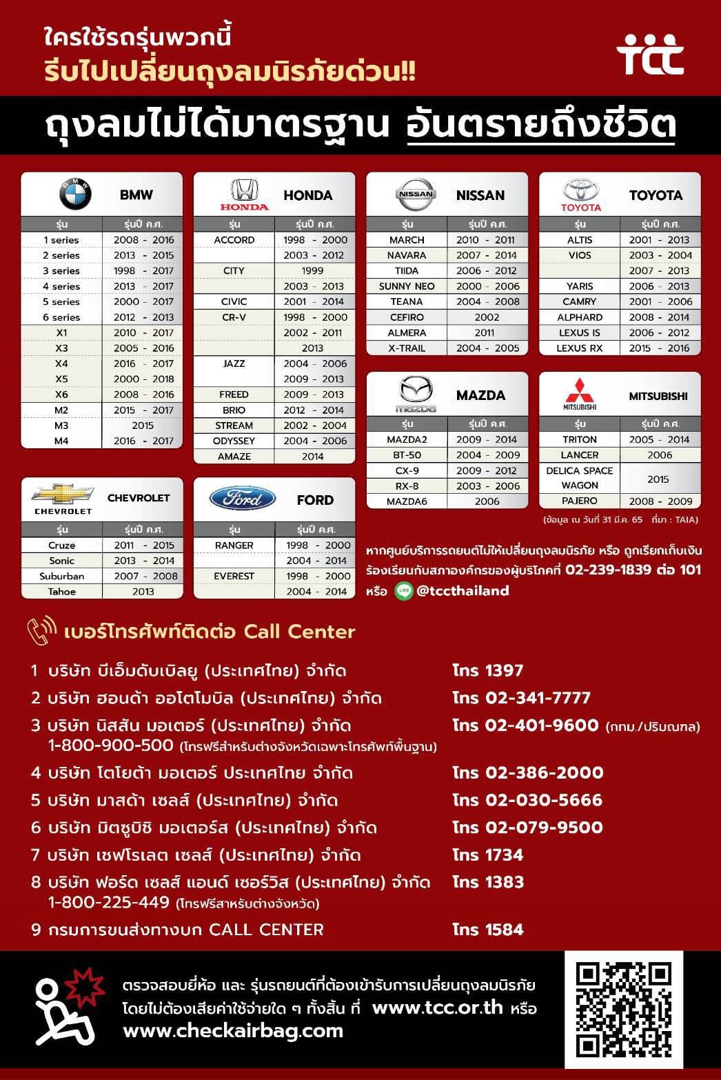 จึงขอให้ผู้บริโภครับทราบถึงอันตราย และขอให้รีบดำเนินการตรวจสอบว่า รถของตัวเองเป็นรุ่นที่ต้องถูกเปลี่ยนฤงลมนิรภัยหรือไม่ โดยสามารถตรวจสอบได้จากหลายช่องทาง เช่น เว็บไซต์ สอบ. https://www.tcc.or.th/ (หรือสแกนคิวอาร์โค้ดด้านบน) เว็บไซต์ของกรมการขนส่งทางบก และเว็บไซต์ https://www.checkairbag.com/