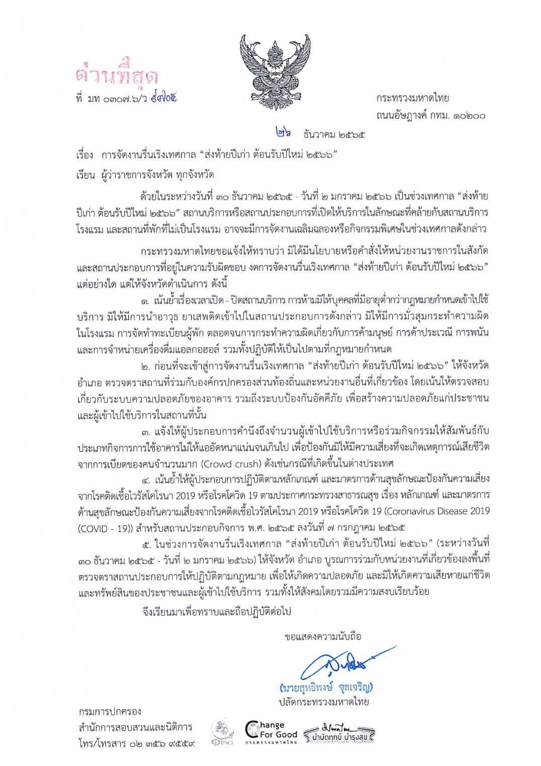 (26 ธ.ค. 65) นายสุทธิพงษ์ จุลเจริญ ปลัดกระทรวงมหาดไทย เปิดเผยว่า ในระหว่างวันที่ 30 ธันวาคม 2565 ถึงวันที่ 2 มกราคม 2566 เป็นช่วงเทศกาลวันขึ้นปีใหม่ 2566 ซึ่งมีวันหยุดต่อเนื่องติดต่อกันหลายวัน สถานบริการหรือสถานประกอบการ ที่เปิดให้บริการในลักษณะที่คล้ายกับสถานบริการ และสถานที่ประกอบธุรกิจโรงแรม อาจมีการจัดงานเฉลิมฉลองหรือกิจกรรมพิเศษ ซึ่งจะมีนักท่องเที่ยวหรือประชาชนเข้าไปใช้บริการและร่วมกิจกรรมจำนวนมาก ทำให้สถานที่ดังกล่าวอาจเกิดความไม่ปลอดภัยขึ้น เช่น เกิดการทะเลาะวิวาททำร้ายร่างกาย หรือเกิดเหตุเพลิงไหม้ ซึ่งจะก่อให้เกิดความเสียหายแก่ชีวิต และทรัพย์สินของผู้มาใช้บริการ รวมทั้งส่งผลกระทบต่อความสงบเรียบร้อยของสังคมโดยรวม