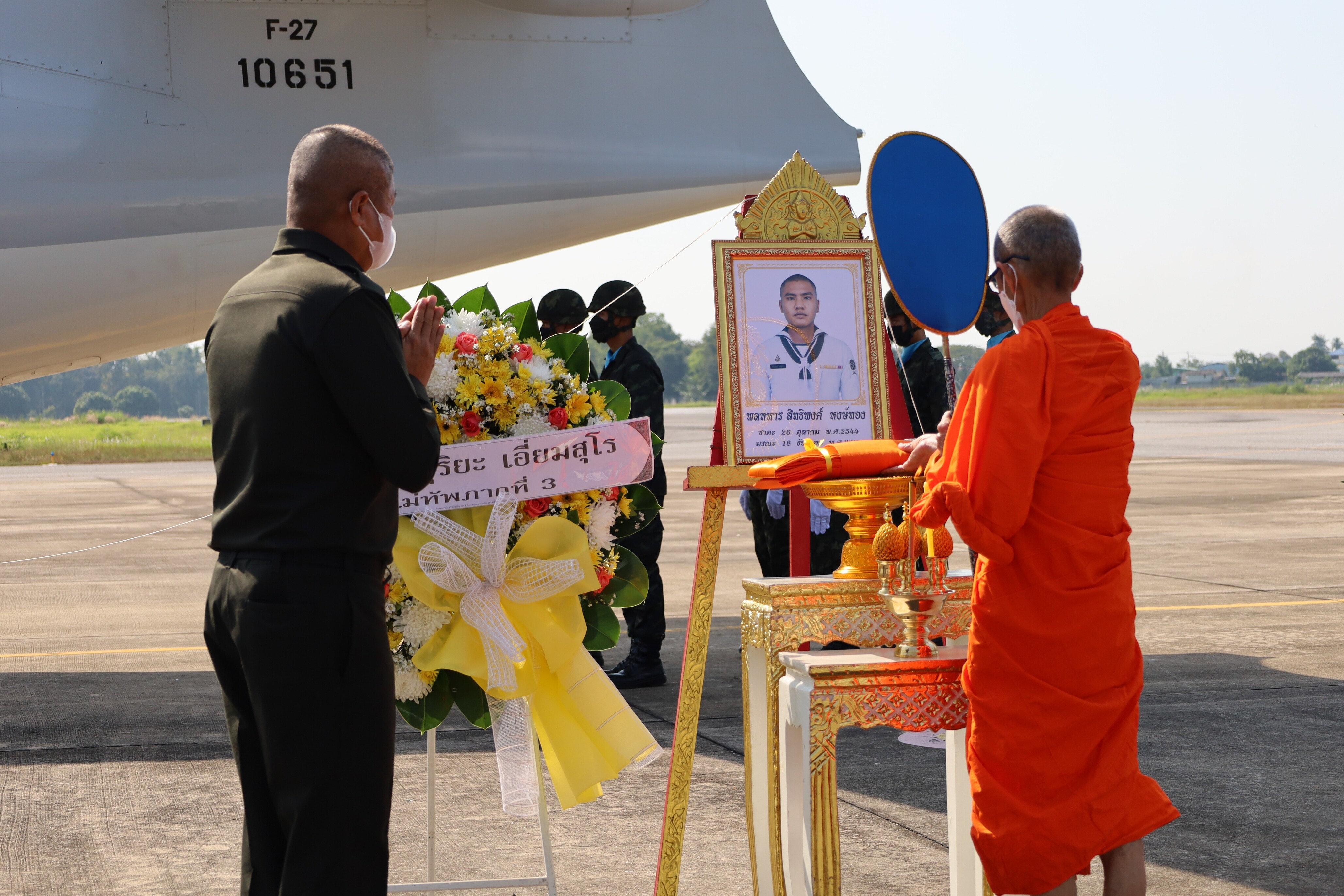 ในวันนี้ 27 ธ.ค. 65 เวลา14.00 น. พลตรี ประสาน แสงศิริรักษ์ รองแม่ทัพภาคที่ 3 เป็นประธานในพิธีรับศพผู้เสียชีวิต พล ฯ สิทธิพงศ์ หงส์ทอง กำลังพลของ ร.ล.สุโขทัย กองเรือยุทธการ ทัพเรือภาคที่ 1 ประสบอุบัติเหตุถูกคลื่นซัดอับปางห่างฝั่ง 19 ไมล์ทะเล อ.บางสะพาน จ.ประจวบคีรีขันธ์ เมื่อคืนวันที่ 18 ธ.ค. 65 ที่ผ่านมา เดินทางกลับบ้านเกิดอย่างสมเกียรติ โดยเจ้าหน้าที่ทหารเรือเคลื่อนย้ายศพผู้เสียชีวิต จากสนามบินอู่ตะเภา จังหวัดระยอง มายังท่าอากาศยานทหารกองบิน 46 จังหวัดพิษณุโลก ก่อนใช้รถยนต์ลำเลียงศพไปยังวัดบ้านเกิด ของพล ฯ สิทธิพงศ์ หงส์ทอง โดยกำหนดจัดพิธีทางศาสนา ณ วัดโปร่งตะคลอง ต.หนองคล้า อ.ไทรงาม จ.กำแพงเพชร ซึ่งทางกองทัพภาคที่ 3 ได้จัดกองทหารเกียรติยศ 1 หมวด พร้อมเจ้าหน้าที่และกำลังพลร่วมพิธีรับและส่งศพผู้เสียชีวิตอย่างสมเกียรติ