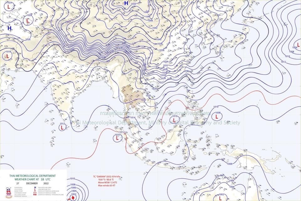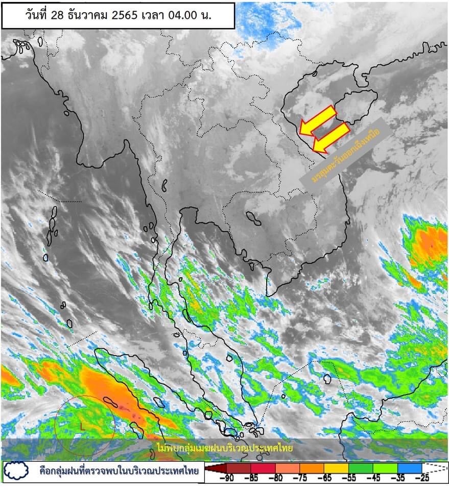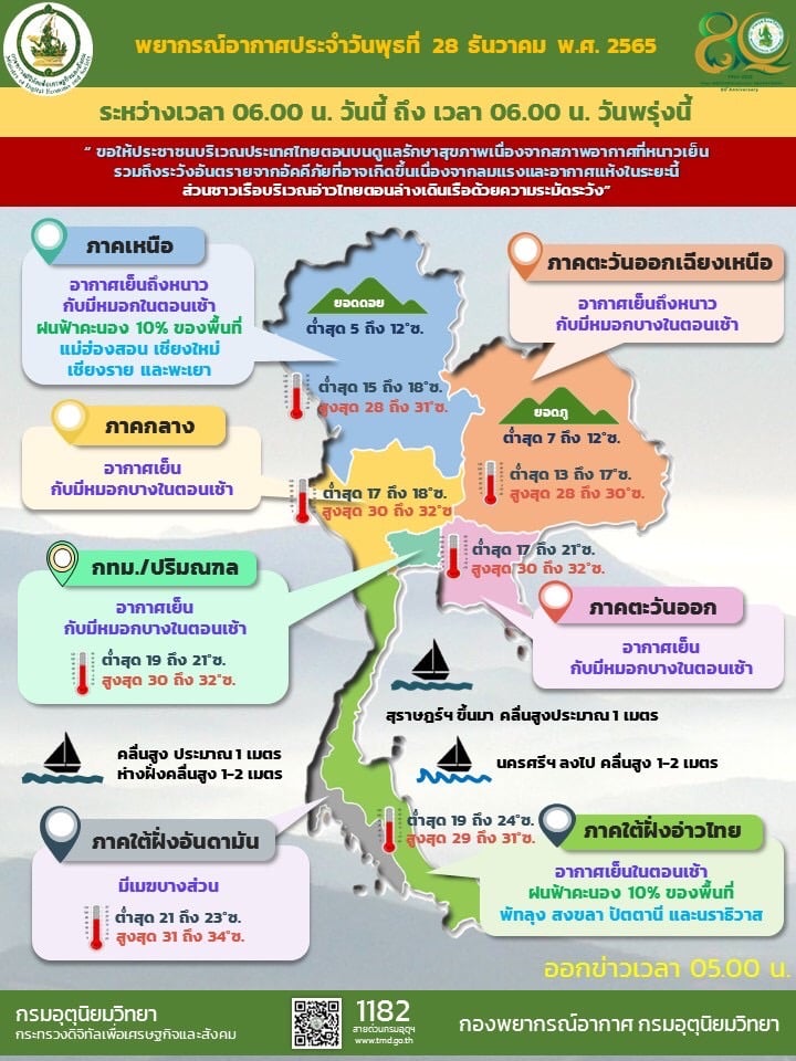 ลักษณะอากาศทั่วไป พยากรณ์อากาศ 24 ชั่วโมงข้างหน้า บริเวณความกดอากาศสูงหรือมวลอากาศเย็นระลอกใหม่ ได้แผ่ลงมาถึงประเทศจีนตอนใต้แล้ว และจะแผ่ลงมาปกคลุมประเทศไทย ในวันที่ 29 ธ.ค. 65 นี้ ทำให้ประเทศไทยตอนบนมีอากาศเย็นถึงหนาว อุณหภูมิจะลดลง 2-4 องศาเซลเซียส ขอให้ประชาชนบริเวณประเทศไทยตอนบน ดูแลรักษาสุขภาพเนื่องจากสภาพอากาศที่หนาวเย็น รวมถึงระวังอันตรายจากอัคคีภัยที่อาจเกิดขึ้น เนื่องสภาพอากาศแห้งในระยะนี้ ในขณะที่คลื่นกระแสลมฝ่ายตะวันตก จะเคลื่อนเข้าปกคลุมตอนบนของภาคเหนือ ในช่วงวันที่ 28 – 30 ธ.ค. 65 ทำให้บริเวณดังกล่าวมีฝนฟ้าคะนองเกิดขึ้นบางแห่ง