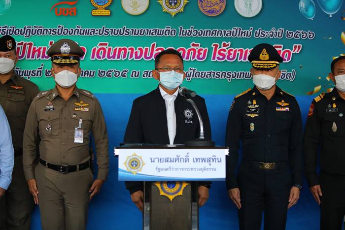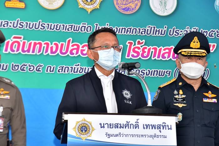 เมื่อวันที่ 28 ธ.ค. 2565 เวลา17.30 น. สถานีขนส่งผู้โดยสารกรุงเทพฯ (หมอชิต) นายสมศักดิ์ เทพสุทิน รมว.ยุติธรรม เปิดปฏิบัติการป้องกันและปราบปรามยาเสพติดในช่วงเทศกาลปีใหม่ 2566 ภายใต้ปฏิบัติการ “ปีใหม่สุขใจ เดินทางปลอดภัย ไร้ยาเสพติด” โดยมี นายวิชัย ไชยมงคล เลขาธิการ ป.ป.ส. พล.ต.ต.สำเริง สวนทอง รองผู้บัญชาการตำรวจนครบาล นายกิจจา สมสุข ผู้อำนวยการกองตรวจการขนส่งทางบก นายสัญลักข์ ปัญวัฒนลิขิต กรรมการผู้จัดการใหญ่บริษัท ขนส่ง จำกัด พญ.ภาวิณี รุ่งทนต์กิจ รองผอ.สำนักอนามัย กรุงเทพมหานคร นายอาคม สุทธิบุญ ผู้ช่วยผอ.เขตจตุจักร พ.ต.อ.ศรายุทธ มั่งเรือน รกท.ผกก.สน.บางซื่อ เจ้าหน้าที่และประชาชนร่วมงาน