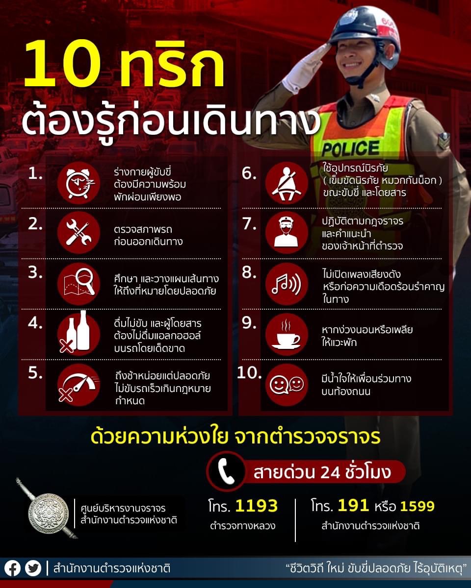 สำนักงานตำรวจแห่งชาติ โดย “พล.ต.อ.ดำรงศักดิ์ กิตติประภัสร์” ผู้บัญชาการตำรวจแห่งชาติ มีความห่วงใยการเดินทางของพี่น้องประชาชน ช่วงเทศกาลปีใหม่ 2566 จึงอยากจะเน้นย้ำ 10 ข้อ ในการขับขี่ปลอดภัย ดังนี้