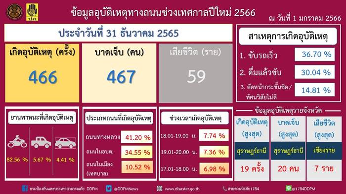 นายโชตินรินทร์ เกิดสม รองปลัดกระทรวงมหาดไทย ในฐานะประธานการประชุมคณะอนุกรรมการเฉพาะกิจศูนย์อำนวยการป้องกันและลดอุบัติเหตุทางถนนตลอดทั้งปี เปิดเผยว่า ศูนย์อำนวยการป้องกันและลดอุบัติเหตุทางถนนช่วงเทศกาลปีใหม่ พ.ศ. 2566 โดยกรมป้องกันและบรรเทาสาธารณภัยและความร่วมมือของหน่วยงานภาคีเครือข่ายได้รวบรวมสถิติอุบัติเหตุทางถนนประจำวันที่ 31 ธันวาคม 2565 ซึ่งเป็นวันที่สามของการรณรงค์ “ชีวิตวิถีใหม่ ขับขี่อย่างปลอดภัย ไร้อุบัติเหตุ” เกิดอุบัติเหตุ 466 ครั้ง ผู้บาดเจ็บ 467 คน ผู้เสียชีวิต 59 ราย สาเหตุที่ทำให้เกิดอุบัติเหตุสูงสุด ได้แก่ ขับรถเร็ว ร้อยละ 36.70 ดื่มแล้วขับ ร้อยละ 30.04 ยานพาหนะที่เกิดอุบัติเหตุสูงสุด ได้แก่ รถจักรยานยนต์ ร้อยละ 82.56 ส่วนใหญ่เกิดบนเส้นทางตรง ร้อยละ 80.90 ถนนกรมทางหลวง ร้อยละ 41.2 ถนนใน อบต./หมู่บ้านร้อยละ 34.55 ช่วงเวลาที่เกิดอุบัติเหตุสูงสุด ได้แก่ ช่วงเวลา 18.01 – 19.00 น. ร้อยละ 7.74 ผู้บาดเจ็บและเสียชีวิตสูงสุด อยู่ในช่วงอายุ 20 – 29 ปี ร้อยละ 19.39 จัดตั้งจุดตรวจหลัก 1,878 จุด เจ้าหน้าที่ปฏิบัติงาน 56,205 คน เรียกตรวจยานพาหนะ 424,745 คัน มีผู้ถูกดำเนินคดี รวม 67,203 ราย มีความผิดฐานไม่มีใบขับขี่ 18,964 ราย ไม่สวมหมวกนิรภัย 18,116 ราย ขับรถเร็วเกินกำหนด 8,497 ราย โดยจังหวัดที่เกิดอุบัติเหตุสูงสุด ได้แก่ สุราษฎร์ธานี (19 ครั้ง) จังหวัดที่มีผู้บาดเจ็บสูงสุด ได้แก่ สุราษฎร์ธานี (20 คน) จังหวัดที่มีผู้เสียชีวิตสูงสุด ได้แก่ เชียงราย (7 ราย) สรุปอุบัติเหตุทางถนนสะสมในช่วง 3 วันของการรณรงค์ (29 – 31 ธ.ค. 65) เกิดอุบัติเหตุรวม 1,183 ครั้ง ผู้บาดเจ็บ รวม 1,182 คน ผู้เสียชีวิต รวม 146 ราย จังหวัดที่ไม่มีผู้เสียชีวิต (ตายเป็นศูนย์) มี 18 จังหวัด จังหวัดที่เกิดอุบัติเหตุสะสมสูงสุดได้แก่ สุราษฎร์ธานี (42 ครั้ง) จังหวัดที่มีผู้บาดเจ็บสะสมสูงสุด ได้แก่ สกลนคร (46 คน) จังหวัดที่มีผู้เสียชีวิตสะสมสูงสุด ได้แก่ เชียงราย (10 ราย) จังหวัดที่ไม่มีผู้เสียชีวิต (ตายเป็นศูนย์) มี 18 จังหวัด อย่างไรก็ตาม วันนี้ (1 ม.ค.66) ยังอยู่ในช่วงเฉลิมฉลองต้อนรับเทศกาลปีใหม่ ประชาชนยังคงเดินทางท่องเที่ยวและทำบุญตามสถานที่ต่างๆ รวมถึงยังมีการจัดงานเฉลิมฉลองและงานรื่นเริงในพื้นที่ ศปถ. จึงได้เน้นย้ำให้จังหวัด อำเภอ และองค์กรปกครองส่วนท้องถิ่นดำเนินมาตรการดูแลความปลอดภัยในการเดินทางอย่างต่อเนื่อง โดยเฉพาะการบังคับใช้กฎหมายกวดขันผู้ขับขี่ที่ไม่มีใบอนุญาตขับรถ ขับรถเร็ว ดื่มแล้วขับ และกลุ่มผู้ใช้รถจักรยานยนต์ที่ไม่สวมหมวกนิรภัย สำหรับการดูแลความปลอดภัยในการใช้รถใช้ถนนในพื้นที่ให้เจ้าหน้าที่ประจำด่านชุมชนเข