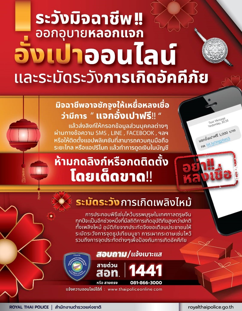 รองโฆษก ตร. ออกโรงเตือนประชาชนระวังมิจฉาชีพออกอุบาย หลอกแจก “อั่งเปาออนไลน์” ย้ำระมัดระวังอัคคีภัยในช่วงเทศกาลตรุษจีน