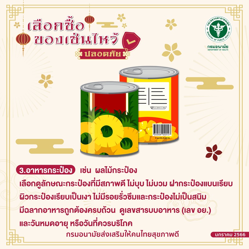 อาหารกระป๋อง เลือกดูลักษณะกระป๋องที่มีสภาพดี ไม่บุบ ไม่บวม ฝากระป็องแบนเรียบ ผิวกระป๋องเรียบเป็นเงา ไม่มีรอยรั่วซึมและกระป๋องไม่เป็นสนิม มีฉลากอาหารถูกต้องครบถ้วน ดูเลขสารบบอาหาร (เลข อย.) และวันหมดอายุ หรือวันที่ควรบริโภค