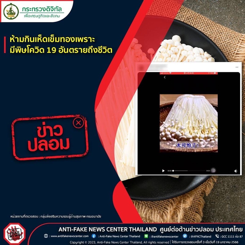 ตามที่มีการบอกต่อข้อมูลเกี่ยวกับประเด็นเรื่องห้ามกินเห็ดเข็มทองเพราะมีพิษโควิด 19 อันตรายถึงชีวิต ทางศูนย์ต่อต้านข่าวปลอมได้ดำเนินการตรวจสอบข้อเท็จจริงกับกลุ่มส่งเสริมความรอบรู้ด้านสุขภาพ กรมอนามัย พบว่าประเด็นดังกล่าวนั้น เป็นข้อมูลเท็จ จากกรณีที่มีการโพสต์ข้อความโดยระบุว่าเห็ดเข็มทองจากเกาหลีและในไทย ทั่ว ๆ ไปห้ามกินเด็ดขาด เพราะมีพิษจากไวรัสโควิด 19 อันตรายถึงชีวิต ทางกลุ่มส่งเสริมความรอบรู้ด้านสุขภาพ กรมอนามัย ได้ตรวจสอบข้อมูลและชี้แจงว่าไม่เป็นความจริง ซึ่งยังไม่มีการตรวจพบเชื้อไวรัสโควิด 19 ในเห็ดดังกล่าว ส่วนสรรพคุณของเห็ดเข็มทองนั้น มีส่วนช่วยลดน้ำตาลในเลือด ลดความดัน และลดระดับคอเลสเตอรอลในเลือด อีกทั้งเห็ดเข็มทองไม่ได้มีสารออกฤทธิ์ หรือสารพิษที่ก่ออันตรายส่งผลต่อร่างกายแต่อย่างใด