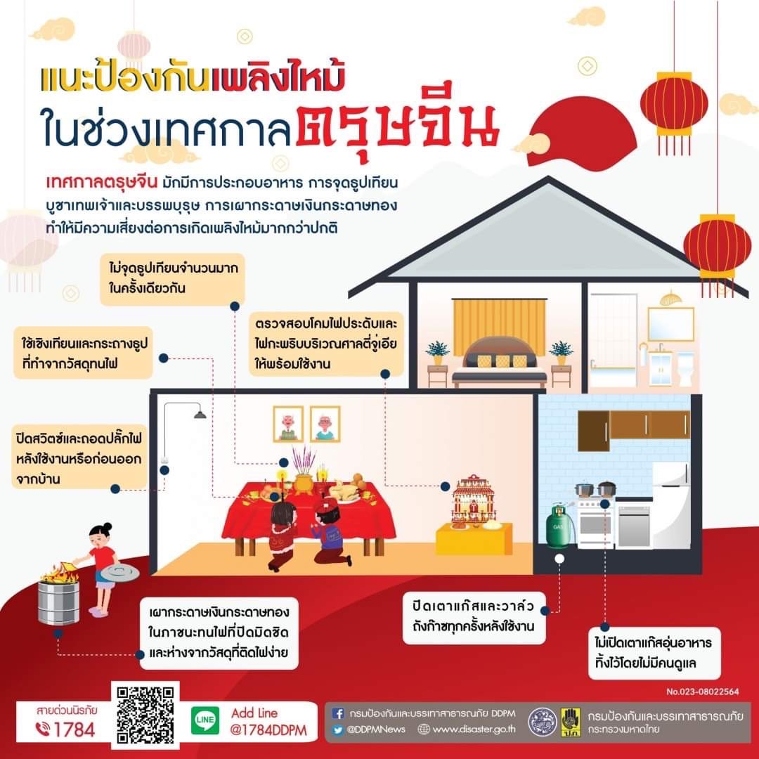กรมป้องกันและบรรเทาสาธารณภัย เตือนประชาชนระมัดระวังเพลิงไหม้ในช่วงเทศกาลตรุษจีน แนะตรวจสอบวาล์วถังก๊าซและดับไฟให้สนิทหลังประกอบอาหาร จุดธูปเทียนและกระดาษเงินกระดาษทองในภาชนะทนไฟที่สามารถควบคุมการลุกลามของไฟได้ง่าย ห้ามจุดธูปเทียนทิ้งไว้โดยไม่มีผู้ดูแลอย่างเด็ดขาด ห้ามจุดประทัดในบ้านเรือนใกล้สายไฟฟ้า เพราะประกายไฟอาจกระเด็นไปถูกวัสดุที่ติดไฟง่ายทำให้เกิดเพลิงไหม้ได้ ตลอดจนตรวจสอบโคมไฟ ถอดปลั๊กหรือปิดสวิตช์เครื่องใช้ไฟฟ้าทุกครั้ง เพื่อป้องกันเพลิงไหม้จากไฟฟ้าลัดวงจร