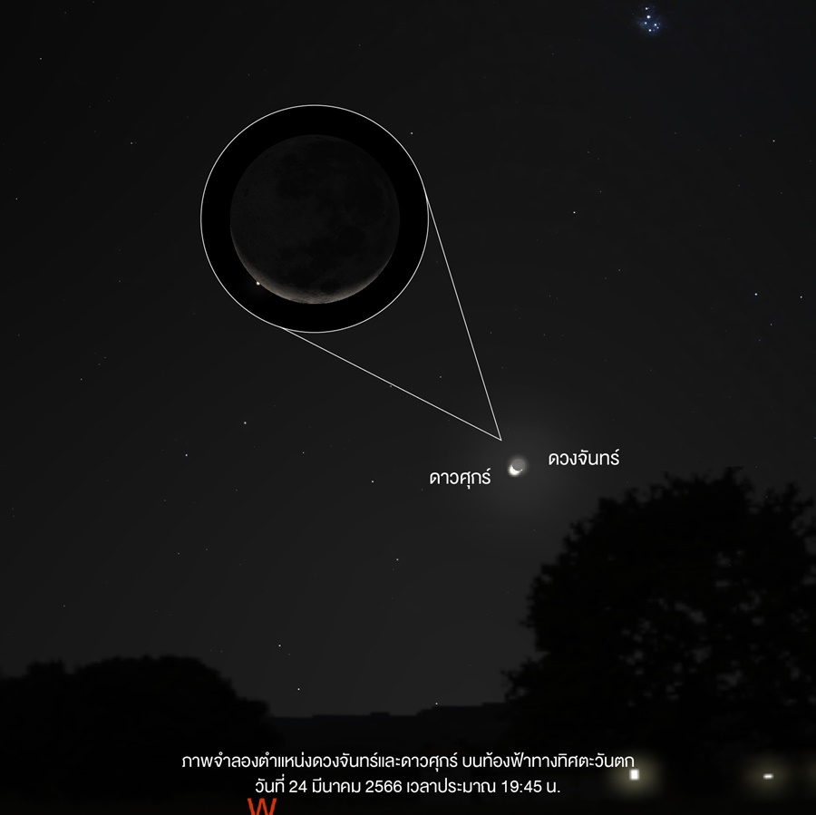 นายศุภฤกษ์ คฤหานนท์ ผู้อำนวยการศูนย์บริการวิชาการและสื่อสารทางดาราศาสตร์ สดร. กล่าวว่า ช่วงหัวค่ำวันที่ 24 มีนาคม 2566 จะเกิดปรากฏการณ์ดวงจันทร์บังดาวศุกร์ เริ่มสังเกตการณ์ได้ตั้งแต่ช่วงหัวค่ำทางทิศตะวันตก วัตถุทั้งสองอยู่เคียงกันสูงจากขอบฟ้าประมาณ 32 องศา ในช่วงเวลาประมาณ 18:37 น. ดวงจันทร์จะค่อยๆ เคลื่อนที่ไปบังดาวศุกร์ และจะเคลื่อนที่ออกจากดาวศุกร์ ในเวลาประมาณ 19:45 น. โดยขณะนั้น ดวงจันทร์อยู่สูงจากขอบฟ้าทิศตะวันตกประมาณ 16 องศา (ข้อมูลดังกล่าวคำนวณจากพื้นที่กรุงเทพมหานคร หากสังเกตการณ์ในพื้นที่อื่น ช่วงเวลาของการบังอาจจะเริ่มและสิ้นสุดไม่พร้อมกัน)