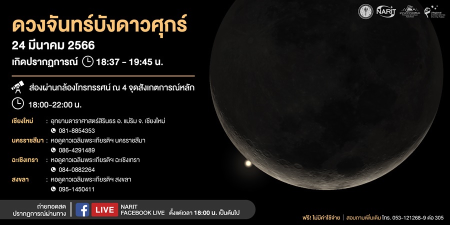 สดร. เตรียมจัดกิจกรรมสังเกตการณ์ “ดวงจันทร์บังดาวศุกร์” เวลา 18:00-22:00 น. ณ จุดสังเกตการณ์หลัก 4 แห่ง ได้แก่ อุทยานดาราศาสตร์สิรินธร อ. แม่ริม จ. เชียงใหม่ และหอดูดาวเฉลิมพระเกียรติ 7 รอบ พระชนมพรรษา นครราชสีมา ฉะเชิงเทรา สงขลา ชมแบบเต็มตาผ่านกล้องโทรทรรศน์ ขณะเกิดปรากฏการณ์ในช่วงหัวค่ำ (เวลาประมาณ 18:37-19:45 น.) รวมเวลากว่า 1 ชั่วโมง 8 นาที หรือรับชมถ่ายทอดสดปรากฏการณ์ ผ่านทางเฟซบุ๊ก NARIT สถาบันวิจัยดาราศาสตร์แห่งชาติ ตั้งแต่เวลา 18:00 เป็นต้นไป