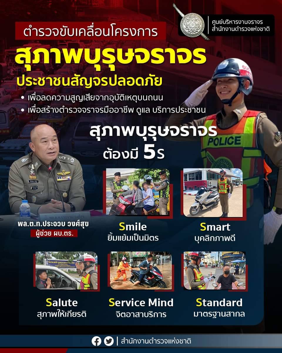 พล.ต.ท.ประจวบ วงศ์สุข ผู้ช่วย ผบ.ตร. ในฐานะ รองผู้อำนวยการศูนย์บริหารงานจราจร สำนักงานตำรวจแห่งชาติ (รอง ผอ.ศจร.ตร.) เปิดเผยว่า ตามนโยบายของรัฐบาล พล.อ.ประยุทธ์ จันทร์โอชา นายกรัฐมนตรีและรัฐมนตรีว่าการกระทรวงกลาโหม และ พล.อ.ประวิตร วงษ์สุวรรณ รองนายกรัฐมนตรี ที่ให้ความสำคัญในการอำนวยความสะดวกการจราจร การป้องกัน และลดอุบัติเหตุ ตลอดจนการเสียชีวิตและบาดเจ็บบนท้องถนน สร้างความปลอดภัยในชีวิตและทรัพย์สินแก่ประชาชนและสังคม นั้น สำนักงานตำรวจแห่งชาติ ภายใต้การนำของ พล.ต.อ.ดำรงศักดิ์ กิตติประภัสร์ ผบ.ตร. และ พล.ต.อ.รอย อิงคไพโรจน์ รอง ผบ.ตร. ได้นำนโยบายรัฐบาลมาสู่การปฏิบัติ โดยได้จัดทำโครงการ “สุภาพบุรุษจราจร ประชาชนสัญจรปลอดภัย”
