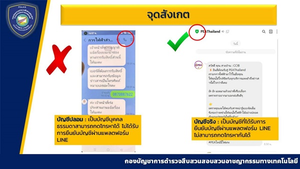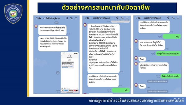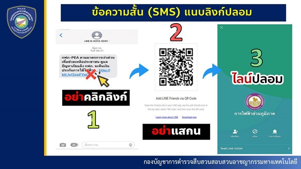 ได้รับรายงานจากกองบังคับการตรวจสอบและวิเคราะห์อาชญากรรมทางเทคโนโลยี (บก.ตอท.) ว่า พบผู้เสียหายหลายรายได้รับข้อความสั้น (SMS) จากมิจฉาชีพซึ่งแอบอ้างเป็นเจ้าหน้าที่การไฟฟ้าส่วนภูมิภาค (กฟภ.) แจ้งว่า ผู้เสียหายมีสิทธิได้รับเงินประกันการใช้ไฟฟ้าคืน เพื่อช่วยเหลือประชาชนตามมาตรการเร่งด่วน เมื่อผู้เสียหายกดลิงก์ที่แนบมากับข้อความดังกล่าว จะเป็นการเพิ่มเพื่อนทางแอปพลิเคชันไลน์ของการไฟฟ้าส่วนภูมิภาคที่มิจฉาชีพปลอมขึ้นมา