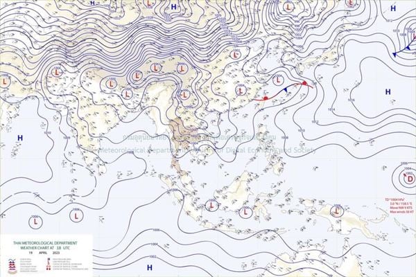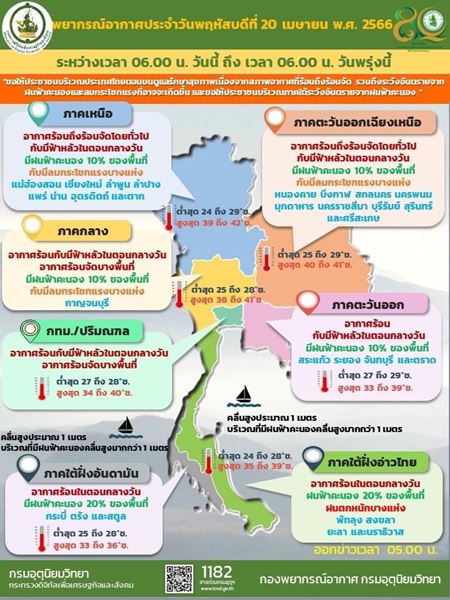 ลักษณะอากาศทั่วไป พยากรณ์อากาศ 24 ชั่วโมงข้างหน้า ประเทศไทยมีอากาศร้อนโดยทั่วไปกับมีฟ้าหลัวในตอนกลางวัน และมีอากาศร้อนจัดบางพื้นที่ ทั้งนี้เนื่องจากความกดอากาศต่ำเนื่องจากความร้อนปกคลุมประเทศไทยตอนบน ในขณะที่ลมตะวันตกเฉียงใต้และลมใต้พัดปกคลุมประเทศไทยตอนบน ลักษณะเช่นนี้ทำให้ประเทศไทยตอนบนยังคงมีฝนฟ้าคะนองเกิดขึ้นได้บางพื้นที่ ขอให้ประชาชนบริเวณประเทศไทยตอนบนดูแลรักษาสุขภาพเนื่องจากสภาพอากาศที่ร้อนถึงร้อนจัด รวมถึงระวังอันตรายจากฝนฟ้าคะนองและลมกระโชกแรงที่อาจจะเกิดขึ้น