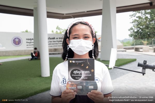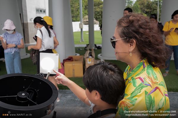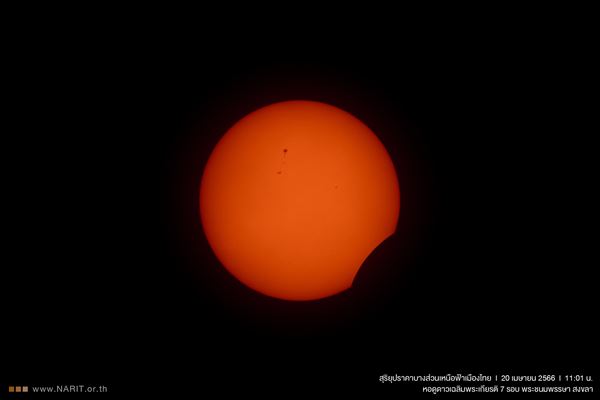 20 เมษายน 2566-สถาบันวิจัยดาราศาสตร์แห่งชาติ (องค์การมหาชน) (สดร.) กระทรวง การอุดมศึกษา วิทยาศาสตร์ วิจัย และนวัตกรรม (อว.) เผยภาพ “สุริยุปราคาบางส่วนเหนือฟ้าเมืองไทย” วันที่ 20 เมษายน 2566 ขณะดวงอาทิตย์ปรากฏเว้าแหว่งมากที่สุดร้อยละ 1.82 เวลา 11:01 น. บันทึกผ่านกล้องโทรทรรศน์ติดแผ่นกรองแสงพอลิเมอร์ดำ ณ หอดูดาวเฉลิมพระเกียรติ 7 รอบ พระชนมพรรษา สงขลา