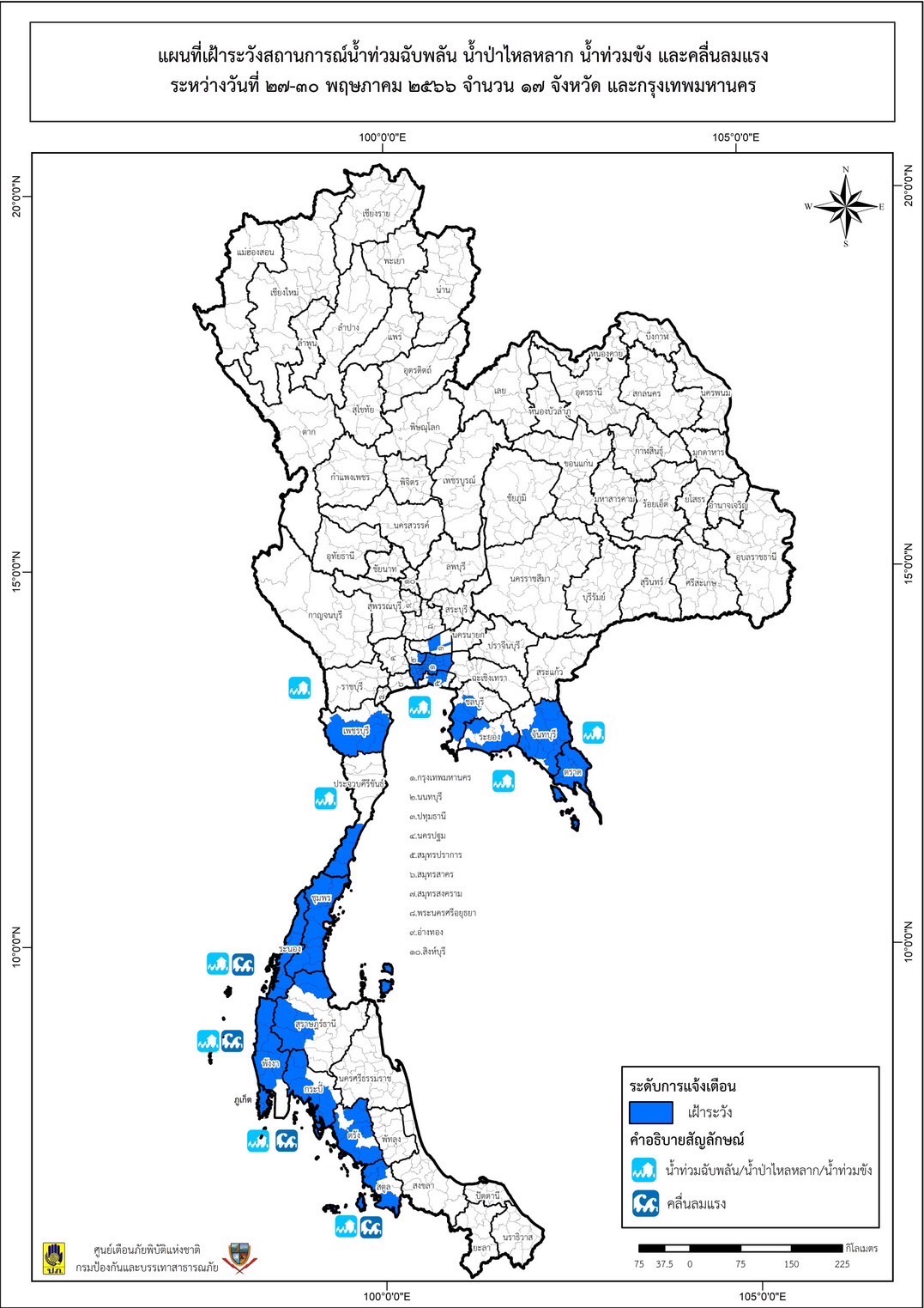 (25 พ.ค.66) เวลา 14.10 น. กองอำนวยการป้องกันและบรรเทาสาธารณภัยกลาง (กอปภ.ก.) โดยกรมป้องกันและบรรเทาสาธารณภัย (ปภ.) แจ้ง 17 จังหวัดภาคกลาง ภาคตะวันออก ภาคใต้ และกรุงเทพมหานคร เฝ้าระวังน้ำท่วมฉับพลัน น้ำป่าไหลหลาก น้ำท่วมขัง และคลื่นลมแรง ช่วงวันที่ 27-30 พ.ค.66 กำชับให้จัดเจ้าหน้าที่ติดตามและเฝ้าระวังสถานการณ์ภัยอย่างใกล้ชิดตลอด 24 ชั่วโมง และจัดทีมปฏิบัติการพร้อมเครื่องจักรกลด้านสาธารณภัยเข้าประจำพื้นที่เสี่ยงเพื่อเข้าเผชิญเหตุและให้การช่วยเหลือประชาชนได้อย่างทันท่วงที