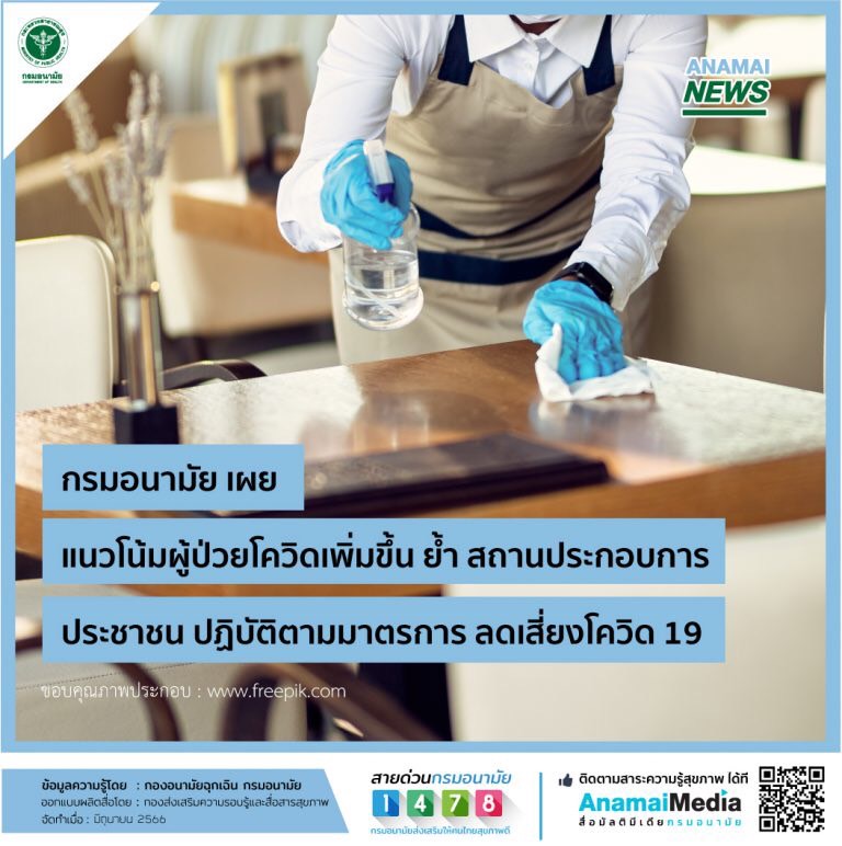 กรมอนามัย กระทรวงสาธารณสุข เผยแนวโน้มผู้ป่วยโควิดเพิ่มขึ้น ย้ำ สถานประกอบการและประชาชน ยังคงต้องปฏิบัติตามมาตรการป้องกัน โควิด 19 เพื่อลดเสี่ยงโรคโควิด 19