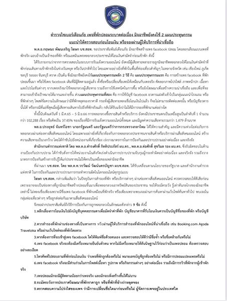 ได้รับรายงานว่าจากการตรวจสอบในระบบการรับแจ้งความออนไลน์ ยังคงมีผู้เสียหายหลายรายถูกมิจฉาชีพหลอกลวงให้โอนเงินค่ามัดจำที่พักก่อนเดินทางเข้าพักจริงในช่วงวันหยุด หรือวันปกติทั่วไป โดยเฉพาะอย่างยิ่งที่พักในพื้นที่ท่องเที่ยวสำคัญๆ ในหลายจังหวัด เช่น เชียงใหม่ กาญจนบุรี ภูเก็ต ชลบุรี ระยอง จันทบุรี ตราด เป็นต้น ซึ่งมิจฉาชีพยังคงใช้แผนประทุษกรรมหลัก 2 วิธี คือ แผนประทุษกรรมแรก คือ การสร้างเพจ facebook ที่พักปลอมขึ้นมา หรือใช้เพจ facebook เดิมที่มีผู้ติดตามอยู่แล้ว ตั้งชื่อหรือเปลี่ยนชื่อเพจให้เหมือนกับเพจจริง คัดลอกภาพโปรไฟล์ ภาพหน้าปก เนื้อหา และโปรโมชันต่างๆ จากเพจจริงมาใช้หลอกลวงผู้เสียหาย รวมถึงการใช้เทคนิคในการซื้อ หรือยิงโฆษณาเพื่อสร้างความน่าเชื่อถือ และเพื่อที่จะสามารถเข้าถึงเป้าหมายได้มากและง่ายขึ้น ส่วนแผนประทุษกรรมที่สอง คือ การใช้บัญชี facebook อวตารแฝงตัวเข้าไปในกลุ่มแนะนำโรงแรม หรือที่พักต่างๆ โพสต์ข้อความในลักษณะว่ามีที่พักหลุดจองราคาดี กระทั่งผู้เสียหายหลงเชื่อโอนเงินไปแล้ว ก็จะไม่สามารถติดต่อเพจนั้น หรือบัญชีอวตารนั้นได้ หรือกรณีที่แย่ที่สุดเมื่อผู้เสียหายเดินทางไปถึงที่พักจริงแล้ว กลับได้รับแจ้งว่าไม่ได้มีการจองที่พักมาแต่อย่างใด