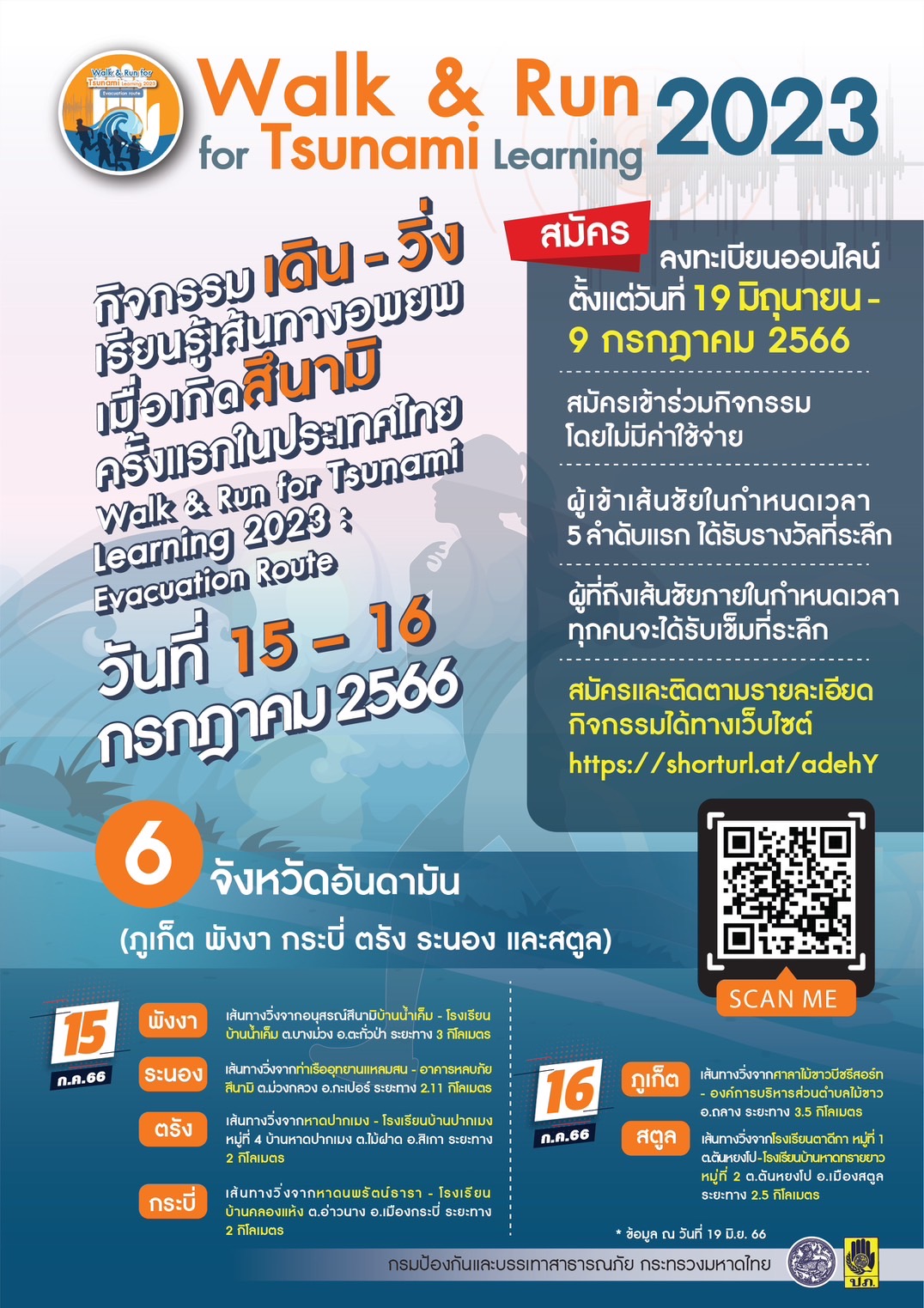 วันนี้ (19 มิ.ย. 66) กรมป้องกันและบรรเทาสาธารณภัย (ปภ.) เปิดลงทะเบียนเข้าร่วมกิจกรรม “Walk & Run for Tsunami Learning 2023” เดิน-วิ่ง เรียนรู้เส้นทางอพยพเมื่อเกิดสึนามิ วันนี้เป็นวันแรก ซึ่งผู้สนใจสามารถลงทะเบียนได้ถึงวันที่ 9 กรกฎาคม 2566 โดยกิจกรรม “Walk & Run for Tsunami Learning 2023” จะจัดขึ้นในวันที่ 15-16 กรกฎาคม 2566 ในพื้นที่ 6 จังหวัดภาคใต้ฝั่งทะเลอันดามัน ได้แก่ ภูเก็ต พังงา กระบี่ ตรัง ระนอง และสตูล ซึ่งถือเป็นครั้งแรกของประเทศไทยที่นำเอาการฝึกการอพยพหนีคลื่นยักษ์สึนามิมารวมกับกิจกรรมการวิ่งเพื่อสุขภาพ โดยใช้เส้นทางการอพยพเป็นเส้นทางการวิ่ง และเส้นชัยคือจุดปลอดภัยที่ได้จัดเตรียมไว้สำหรับการอพยพหนีคลื่นสึนามิโดยเฉพาะ