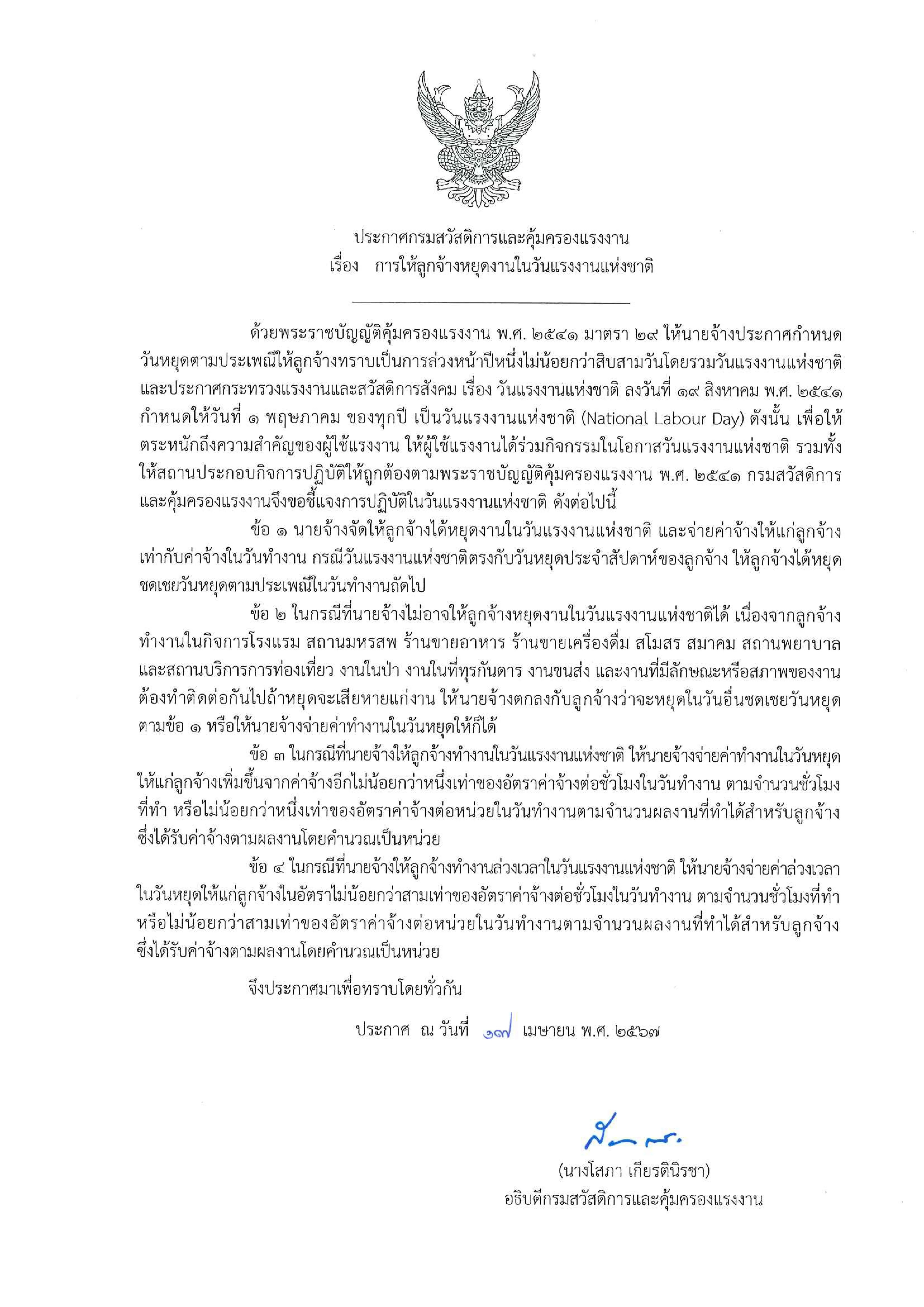 นางโสภา เกียรตินิรชา อธิบดีกรมสวัสดิการและคุ้มครองแรงงาน (กสร.) เปิดเผยว่า พระราชบัญญัติคุ้มครองแรงงาน พ.ศ. 2541 ได้กำหนดให้นายจ้างประกาศกำหนดวันหยุดตามประเพณีให้ลูกจ้างทราบเป็นการล่วงหน้าปีหนึ่งไม่น้อยกว่า 13 วันโดยรวมวันแรงงานแห่งชาติ วันที่ 1 พฤษภาคมด้วย กสร. จึงขอฝากย้ำเตือนไปยังนายจ้าง สถานประกอบกิจการให้ปฏิบัติตามกฎหมายอย่างเคร่งครัด โดยจัดให้ลูกจ้างได้หยุดงานในวันแรงงานแห่งชาติและจ่ายค่าจ้างให้แก่ลูกจ้างเท่ากับค่าจ้างในวันทำงาน กรณีที่วันแรงงานแห่งชาติตรงกับวันหยุดประจำสัปดาห์ของลูกจ้าง ให้ลูกจ้างได้หยุดชดเชยวันหยุดตามประเพณีในวันทำงานถัดไป สำหรับกรณีที่นายจ้างไม่อาจให้ลูกจ้างหยุดงานในวันดังกล่าวได้เนื่องจากลูกจ้างทำงานในกิจการโรงแรม สถานมหรสพร้านขายอาหาร ร้านขายเครื่องดื่ม สโมสร สมาคม สถานพยาบาลและสถานบริการการท่องเที่ยว งานในป่า งานในที่ทุรกันดาร งานขนส่ง และงานที่มีลักษณะงานหรือสภาพของงานต้องทำติดต่อกันไปถ้าหยุดจะเสียหายแก่งานนั้น ให้นายจ้างตกลงกับลูกจ้างว่าจะหยุดชดเชยในวันอื่นแทนหรือให้นายจ้างจ่ายค่าทำงานในวันหยุดให้ก็ได้