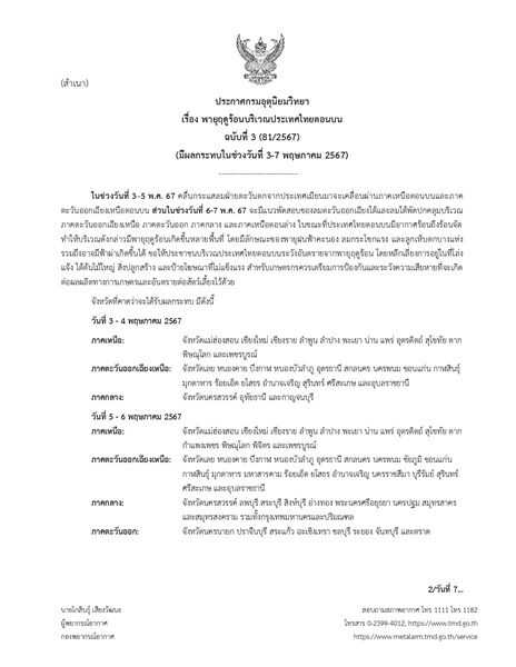 กรมอุตุนิยมวิทยา ประกาศ เรื่อง พายุฤดูร้อนบริเวณประเทศไทยตอนบน ฉบับที่ 3 (81/2567) (มีผลกระทบในช่วงวันที่ 3-7 พฤษภาคม 2567) ระบุว่า ในช่วงวันที่ 3-5 พ.ค. 67 คลื่นกระแสลมฝ่ายตะวันตกจากประเทศเมียนมาจะเคลื่อนผ่านภาคเหนือตอนบนและภาคตะวันออกเฉียงเหนือตอนบน