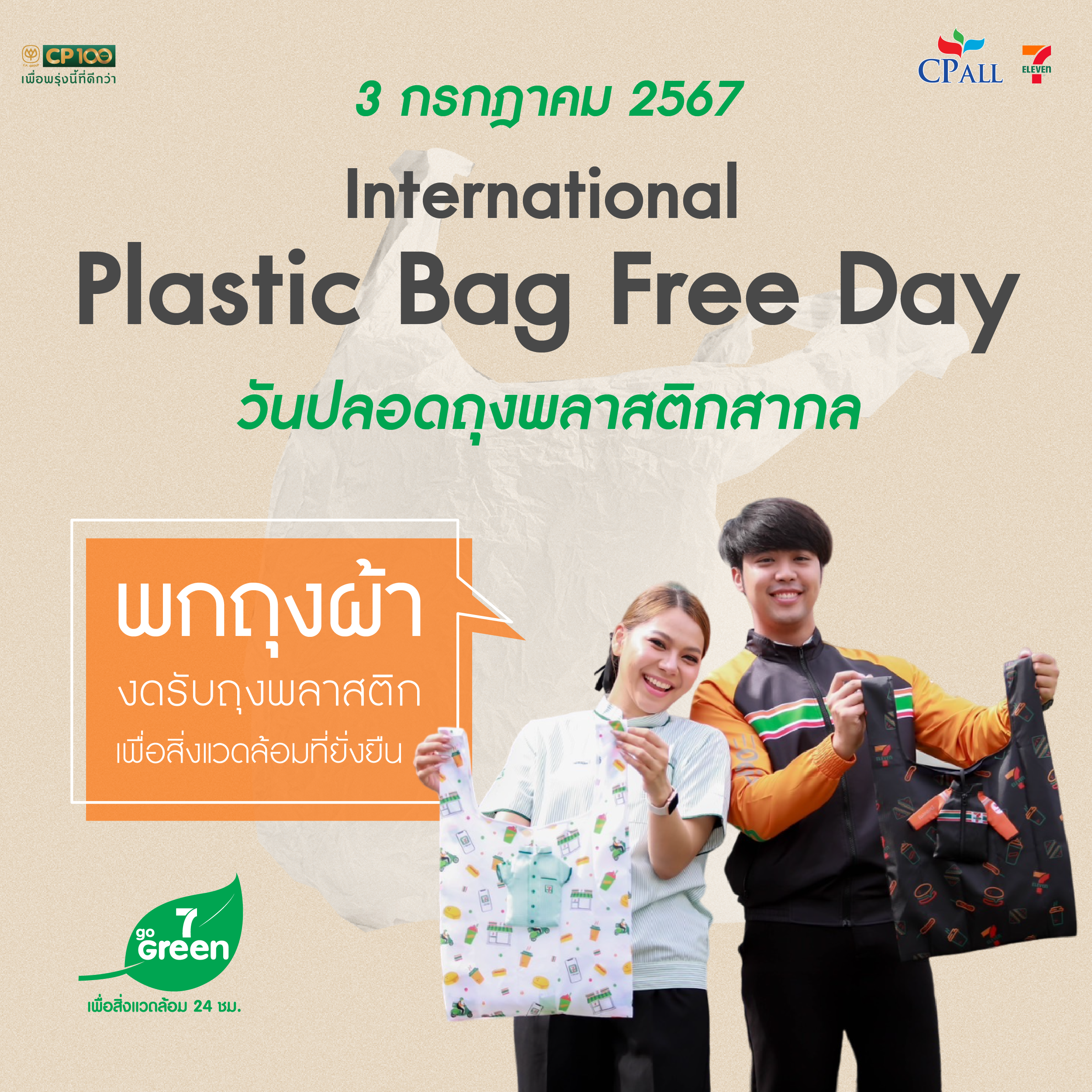 ซีพี ออลล์ ผู้บริหารเซเว่น อีเลฟเว่น และเซเว่น เดลิเวอรี่ เล็งเห็นถึงผลกระทบที่เกิดจากการใช้พลาสติก เนื่องในวันปลอดถุงพลาสติกสากล จึงอยากเชิญชวนประชาชนชาวไทยร่วมกันลดและเลิกการใช้ถุงพลาสติก ถุงหูหิ้วชนิดบาง(ถุงก๊อบแก๊บ) เพียงแค่ปรับเปลี่ยนพฤติกรรมการใช้ชีวิตประจำวัน เริ่มจากการปฏิเสธการรับถุงหิ้วพลาสติก เปลี่ยนมาใช้ถุงผ้าหรือกระเป๋าผ้าแทน รวมถึงขอเชิญชวนร่วมกันลดและเลิกการใช้ Single-Use Plastic อาทิ กล่องโฟมบรรจุอาหาร แก้ว หลอดพลาสติก ช้อน ส้อมพลาสติก (แบบใช้ครั้งเดียวทิ้ง) จะช่วยลดจำนวนขยะพลาสติกที่เกิดขึ้นในสิ่งแวดล้อมไปด้วยกัน