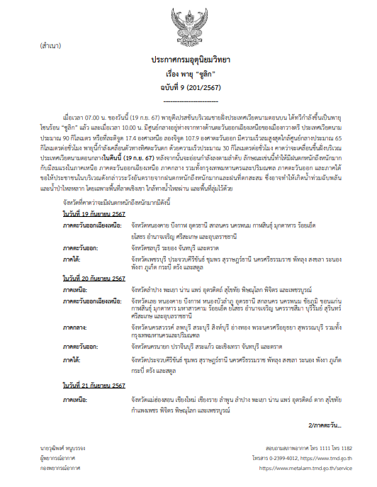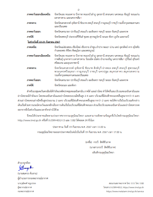 กรมอุตุนิยมวิทยาจะออกประกาศฉบับต่อไปในวันที่ 19 กันยายน พ.ศ. 2567 เวลา 17.00 น.