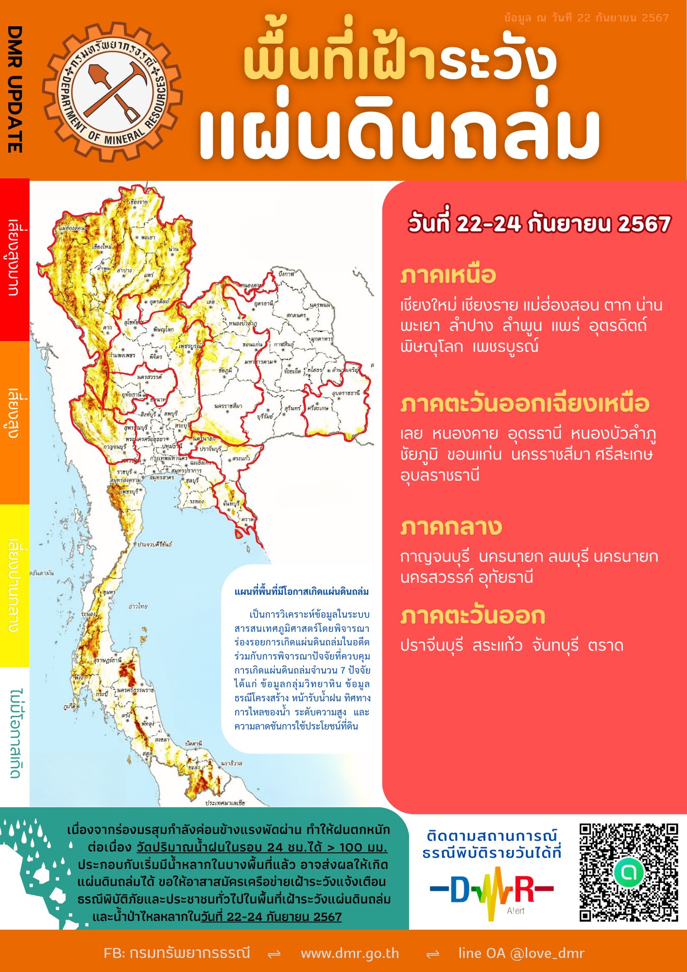 23 ก.ย. 67 กรมทรัพยากรธรณี เตือนเฝ้าระวังแผ่นดินถล่ม ระหว่างวันที่ 22-24 กันยายน 2567 โดยขอให้อาสาสมัครเครือข่ายในพื้นที่จังหวัด เลย ,หนองคาย ,หนองบัวลำภู ,อุดรธานี ,ชัยภูมิ ,ขอนแก่น ,นครราชสีมา ,ศรีสะเกษ ,อุบลราชธานี ,แพร่ ,น่าน ,พะเยา ,อุตรดิตถ์ ,เชียงใหม่ ,เชียงราย ,ลำพูน ,ลำปาง ,ตาก ,แม่ฮ่องสอน ,พิษณุโลก ,เพชรบูรณ์ ,นครสวรรค์ ,อุทัยธานี ,กาญจนบุรี ,ลพบุรี ,นครนายก ,ปราจีนบุรี ,สระแก้ว ,จันทบุรี ,ตราด
