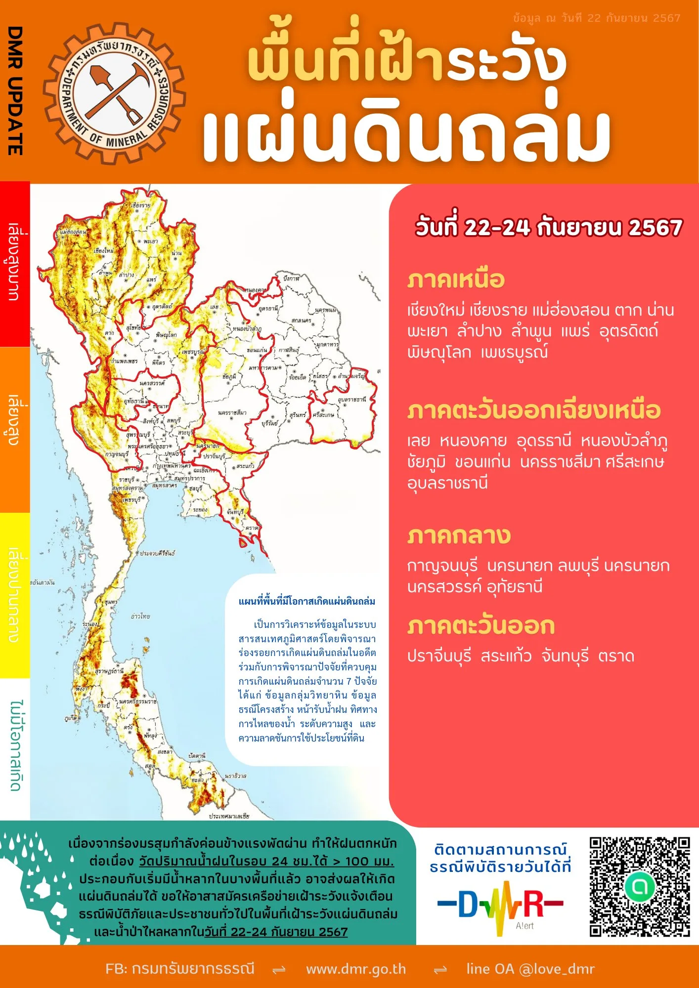 23 ก.ย. 67 กรมทรัพยากรธรณี เตือนเฝ้าระวังแผ่นดินถล่ม ระหว่างวันที่ 22-24 กันยายน 2567 โดยขอให้อาสาสมัครเครือข่ายในพื้นที่จังหวัด เลย ,หนองคาย ,หนองบัวลำภู ,อุดรธานี ,ชัยภูมิ ,ขอนแก่น ,นครราชสีมา ,ศรีสะเกษ ,อุบลราชธานี ,แพร่ ,น่าน ,พะเยา ,อุตรดิตถ์ ,เชียงใหม่ ,เชียงราย ,ลำพูน ,ลำปาง ,ตาก ,แม่ฮ่องสอน ,พิษณุโลก ,เพชรบูรณ์ ,นครสวรรค์ ,อุทัยธานี ,กาญจนบุรี ,ลพบุรี ,นครนายก ,ปราจีนบุรี ,สระแก้ว ,จันทบุรี ,ตราด