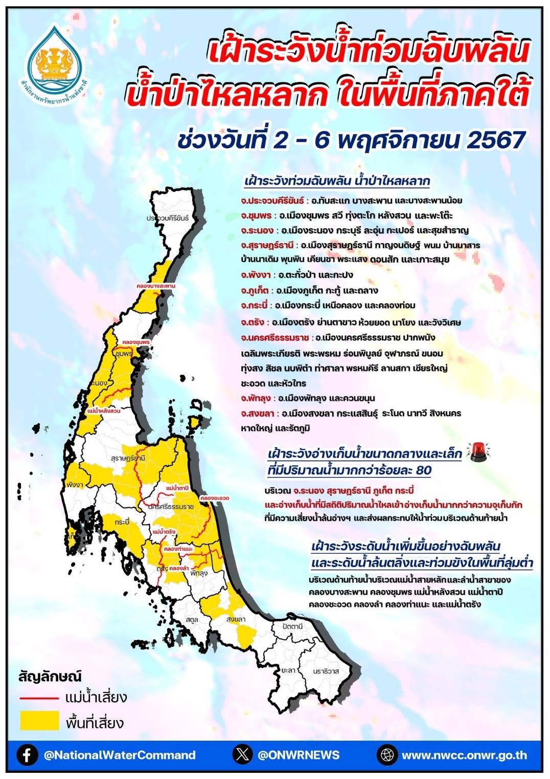 นที่เฝ้าระวังอ่างเก็บน้ำขนาดกลางและขนาดเล็กที่มีปริมาณน้ำมากกว่าร้อยละ 80 บริเวณจังหวัดระนอง สุราษฎร์ธานี ภูเก็ต กระบี่ และอ่างเก็บน้ำที่มีสถิติปริมาณน้ำไหลเข้าอ่างเก็บน้ำมากกว่าความจุเก็บกักที่มีความเสี่ยงน้ำล้นอ่าง และส่งผลกระทบให้น้ำท่วมบริเวณด้านท้ายน้ำ