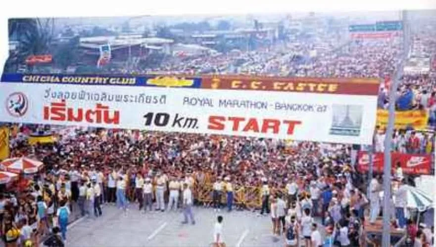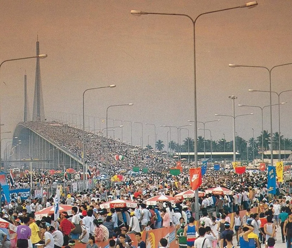 วันที่ 22 พฤศจิกายน 2530 #มหกรรมวิ่งลอยฟ้าเฉลิมพระเกียรติ#เปิดสะพานพระราม9 สะพานเสาขึงระนาบเดี่ยวแห่งแรกของประเทศไทย และนับเป็น #การแข่งขันวิ่งมาราธอนนานาชาติครั้งแรกของประเทศไทย
