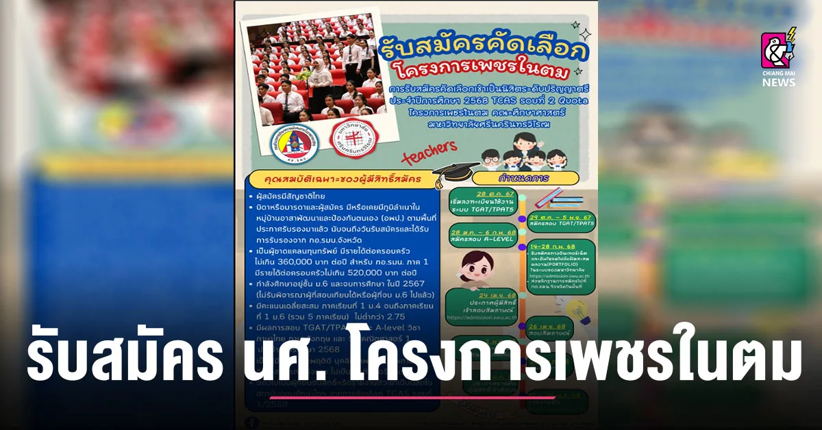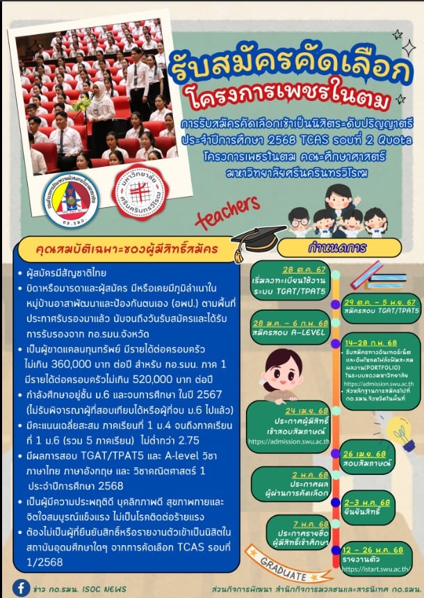 ปัจจุบัน กองอำนวยการรักษาความมั่นคงภายในภาค 3 ได้ประกาศเปิดรับสมัครบุคคล เพื่อคัดเลือกเข้าเป็นนิสิตระดับปริญญาตรี ประจำปีการศึกษา 2568 TCAS รอบที่ 2 Quota โครงการเพชรในตม คณะศึกษาศาสาตร์ มหาวิทยาลัยศรีนครินทรวิโรฒ รุ่นที่ 40 เพื่อเข้าศึกษาต่อสาขาวิชาเอกการประถมศึกษาหลักสูตรการศึกษาบัณฑิต ในพื้นที่ 17 จังหวัดภาคเหนือ จำนวน 34 คน (จังหวัดละ 2 คน) ระหว่างวันที่ 14 – 28 กุมภาพันธ์ 2568 จากผู้สมัครที่มีภูมิลำเนาอยู่ในหมู่บ้านอาสาพัฒนาและป้องกันตนเอง (อพป.) ทั้ง 17 จังหวัดภาคเหนือ ดูรายละเอียดเพิ่มเติมที่ www.swu.ac.th หรือสามารถสอบถามเพิ่มเติมได้ที่กองอำนวยการรักษาความมั่นคงภายในจังหวัดทุกแห่งใกล้บ้านท่าน