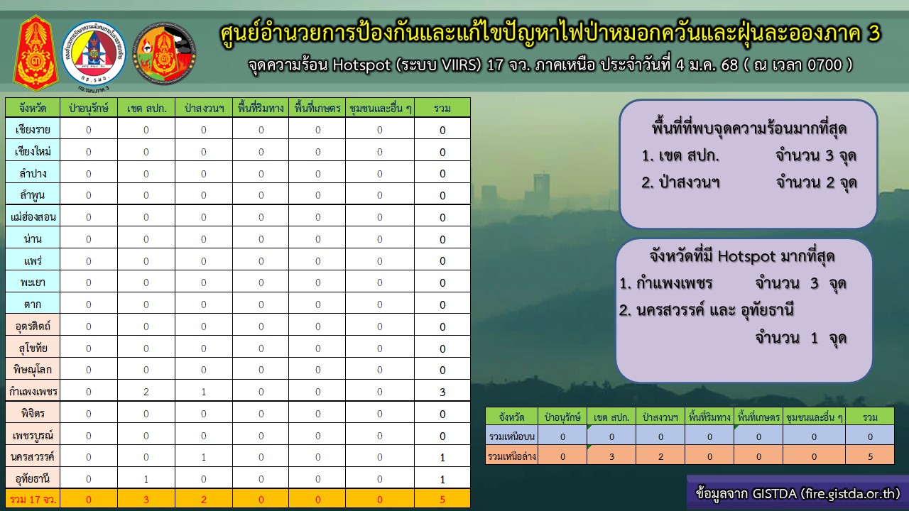 🔴 จุดความร้อน : ตรวจพบจุดความร้อน ในพื้นที่ 17 จังหวัดภาคเหนือ จำนวน 5 จุด สูงสุดที่ จ.กำแพงเพชร จำนวน 3 จุด รองลงมาคือ จ.นครสวรรค์, จ.อุทัยธานี จำนวน 1 จุด ส่วนใหญ่อยู่ในเขต สปก. จำนวน 3 จุด รองลงมาคือ ป่าสงวนฯ จำนวน 2 จุด